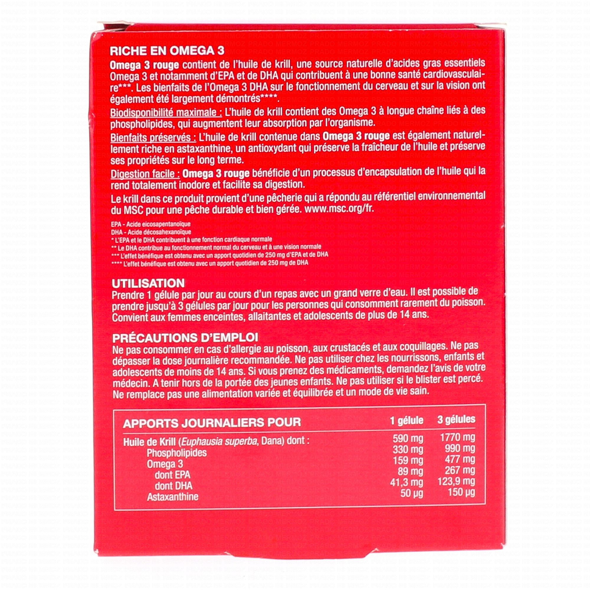 Omega 3 rouge™ ne contient pas de gélatine, de sucre, de sel, de gluten, de levure, de soja, de sésame, de produits laitiers, de fruits à coque et d'arachide. Omega 3 rouge™ est formulé sans utilisation de conservateurs, d'arômes ou de colorants artificiels. Non testé sur des animaux.