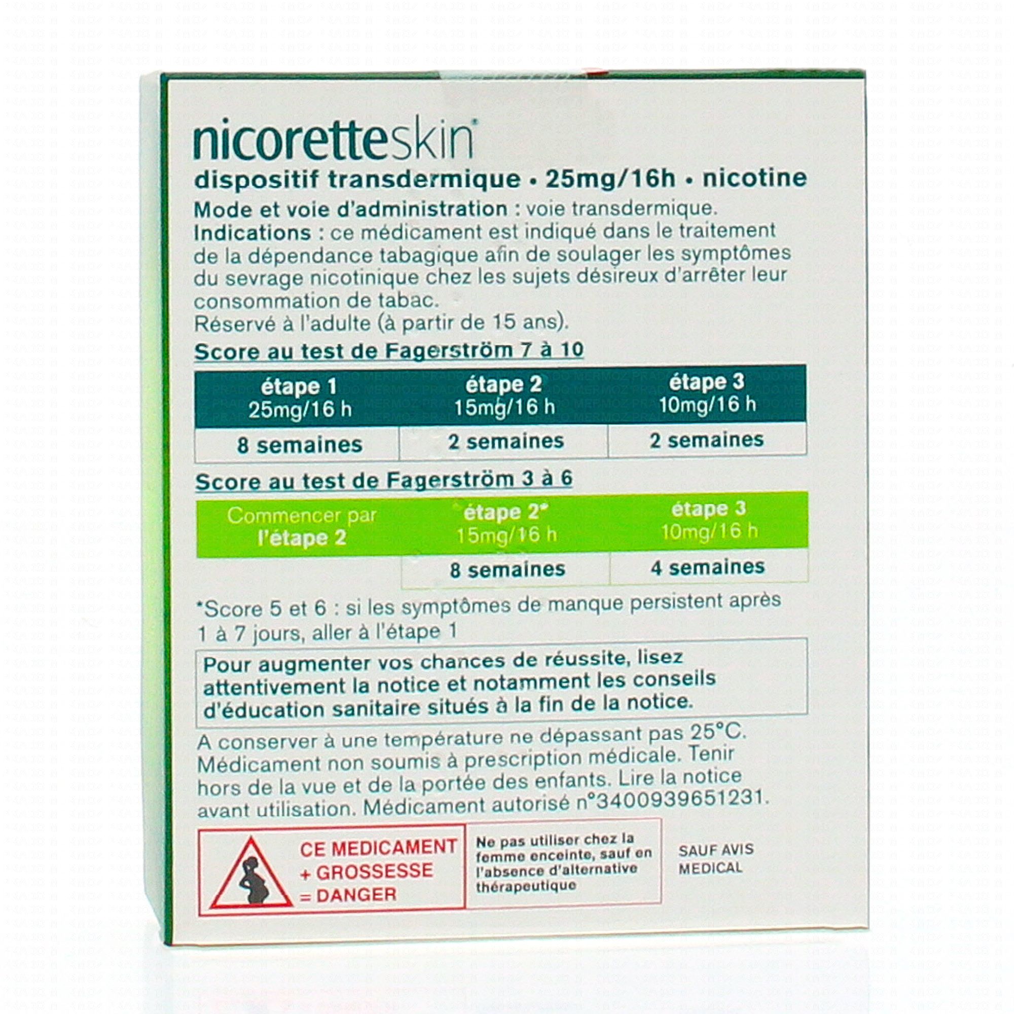 Pour un dispositif transdermique 22,5 cm2 : Nicotine 39,37 mg. Un dispositif transdermique délivre 25 mg de nicotine pendant 16 heures.