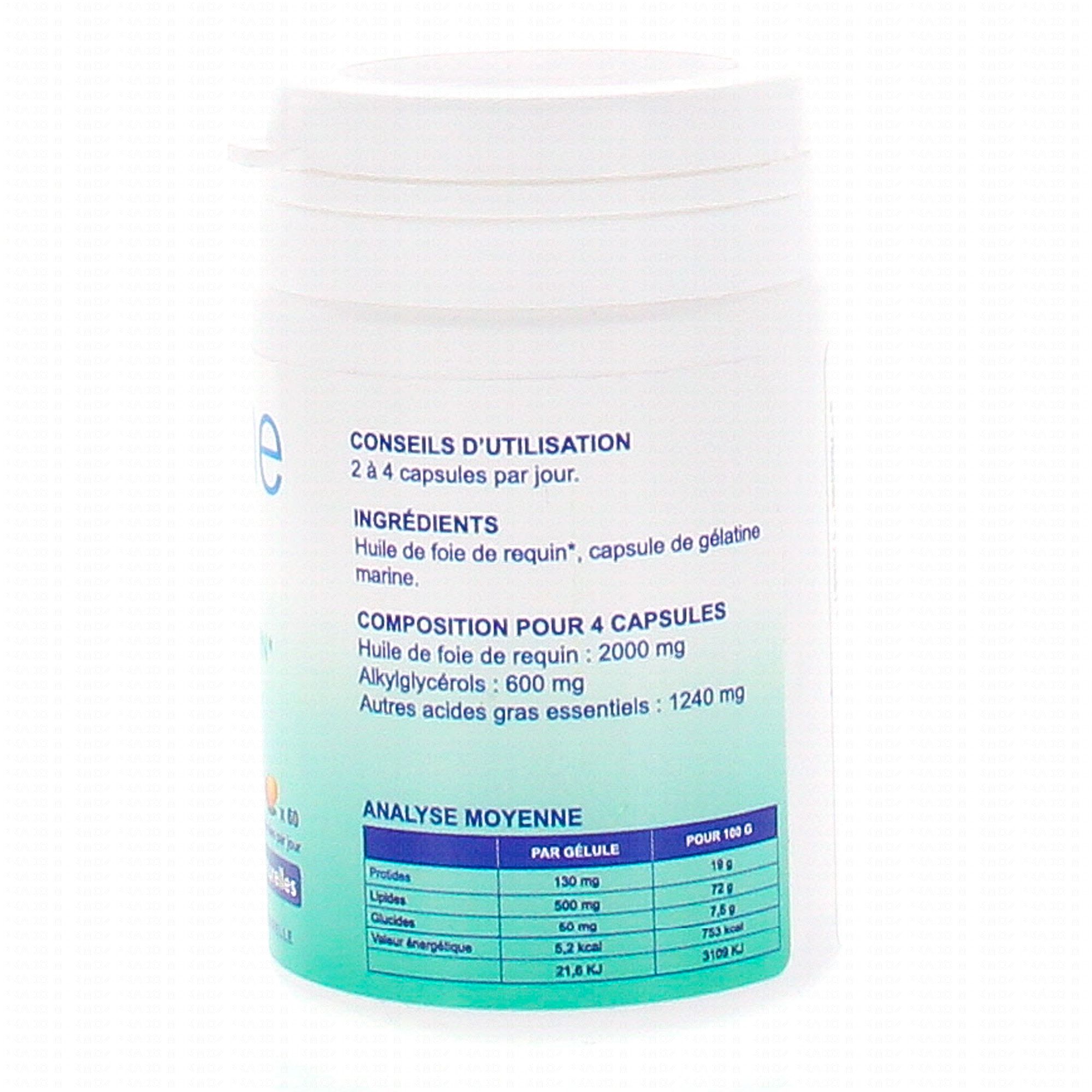 Huile de requin chimère naturellement riche en alkyl-glycérols. Présents dans le foie, la rate et la moelle osseuse, ces acides gras participent aux défenses naturelles. Sans colorant, sans conservateur. Conditionnement : pot plastique. Immunité.