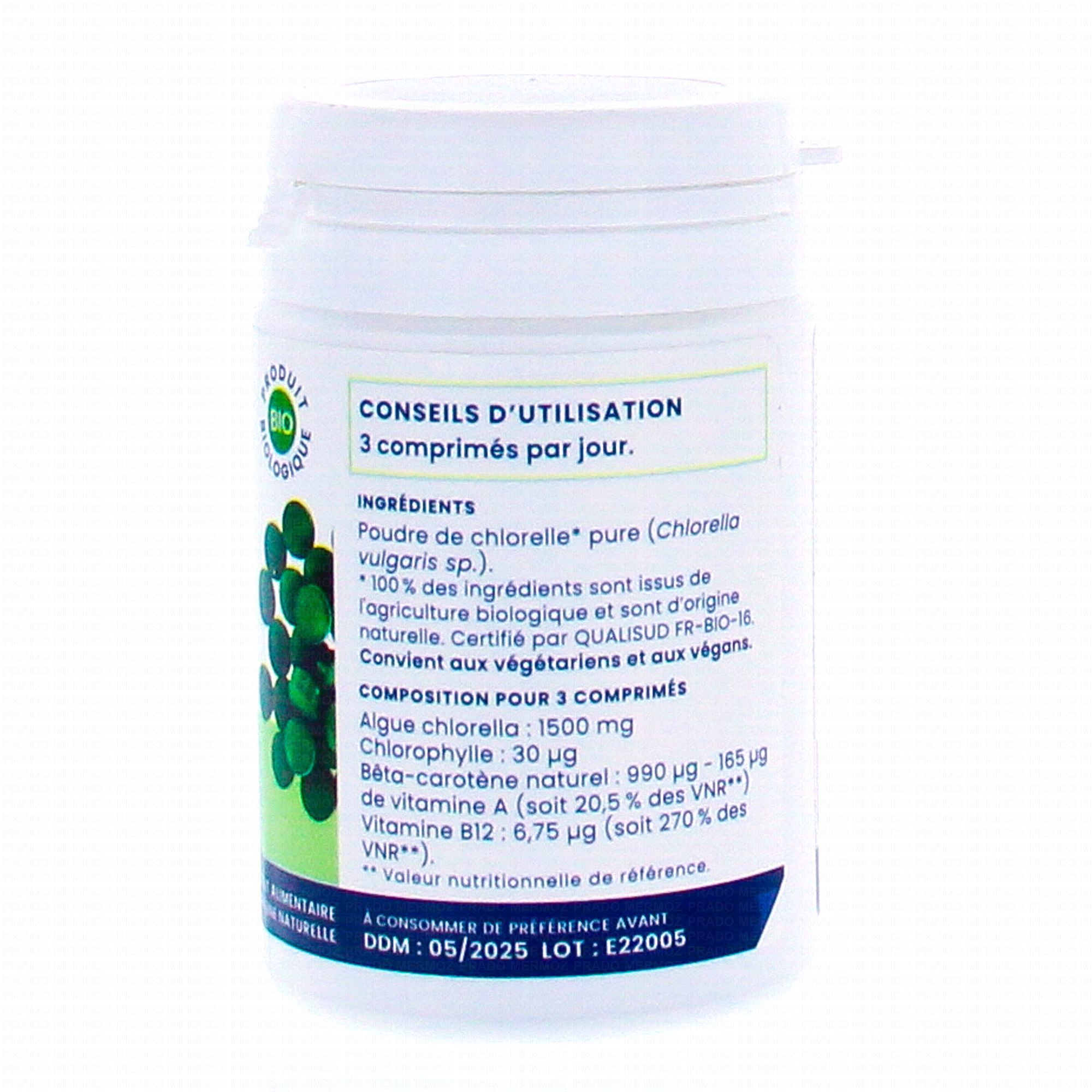 Composition moyenne pour 2 comprimés: algue chlorella biologique: 1000 mg ; chlorophylle: 20 mg ; Bêta-carotène: 589 UI soit 32% des AR** de vitamine A ; vitamine B1: 0.13mg soit 11% des AR** ; vitamine K: 2.6µg soit 3% des AR**.