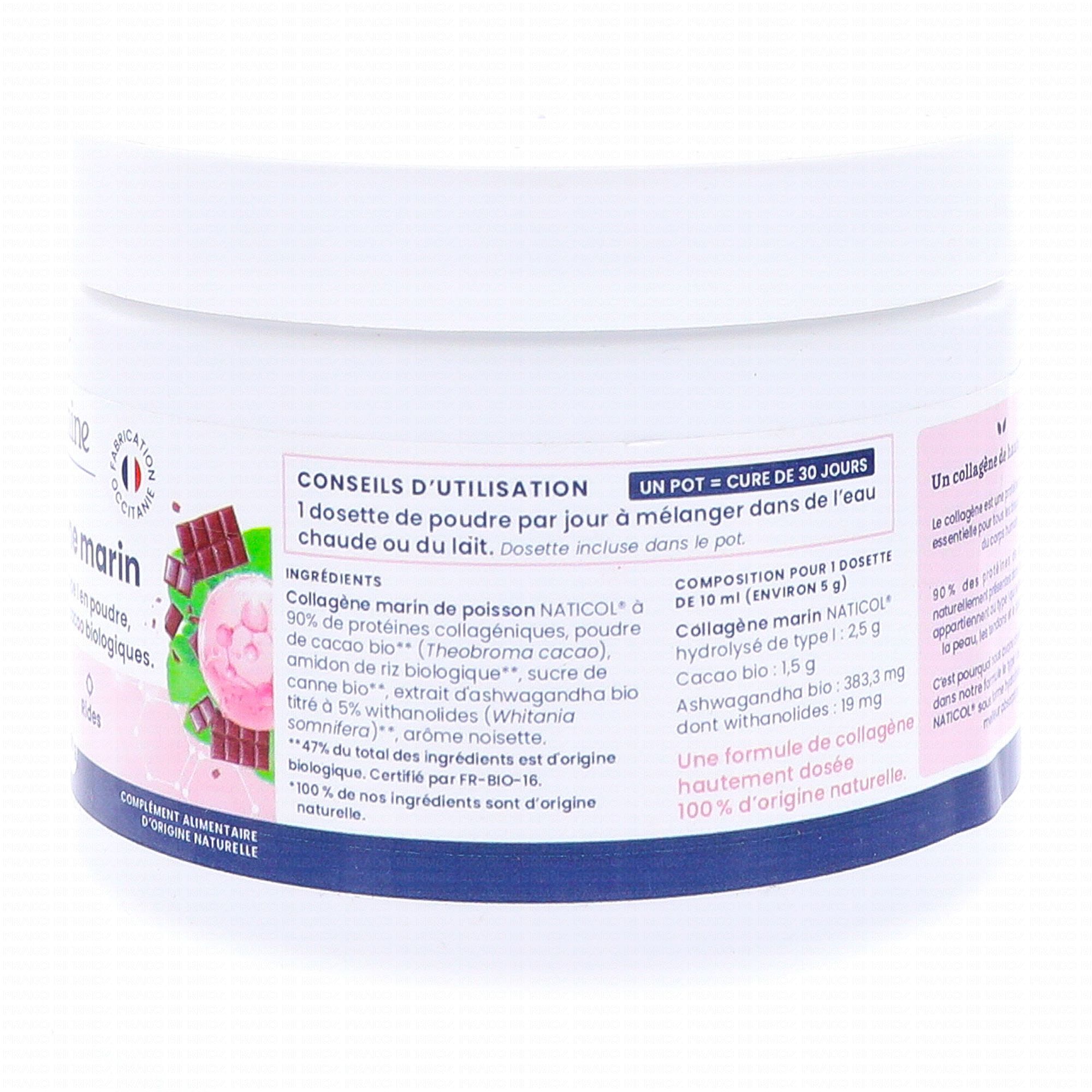 Collagène marin de poisson NATICOL® à 90% de protéines collagéniques, poudre de cacao bio** (Theobroma cacao), amidon de riz biologique**, sucre de canne bio**, extrait d'ashwagandha bio titré à 5% withanolides (Whitania somnifera)**, arôme noisette.