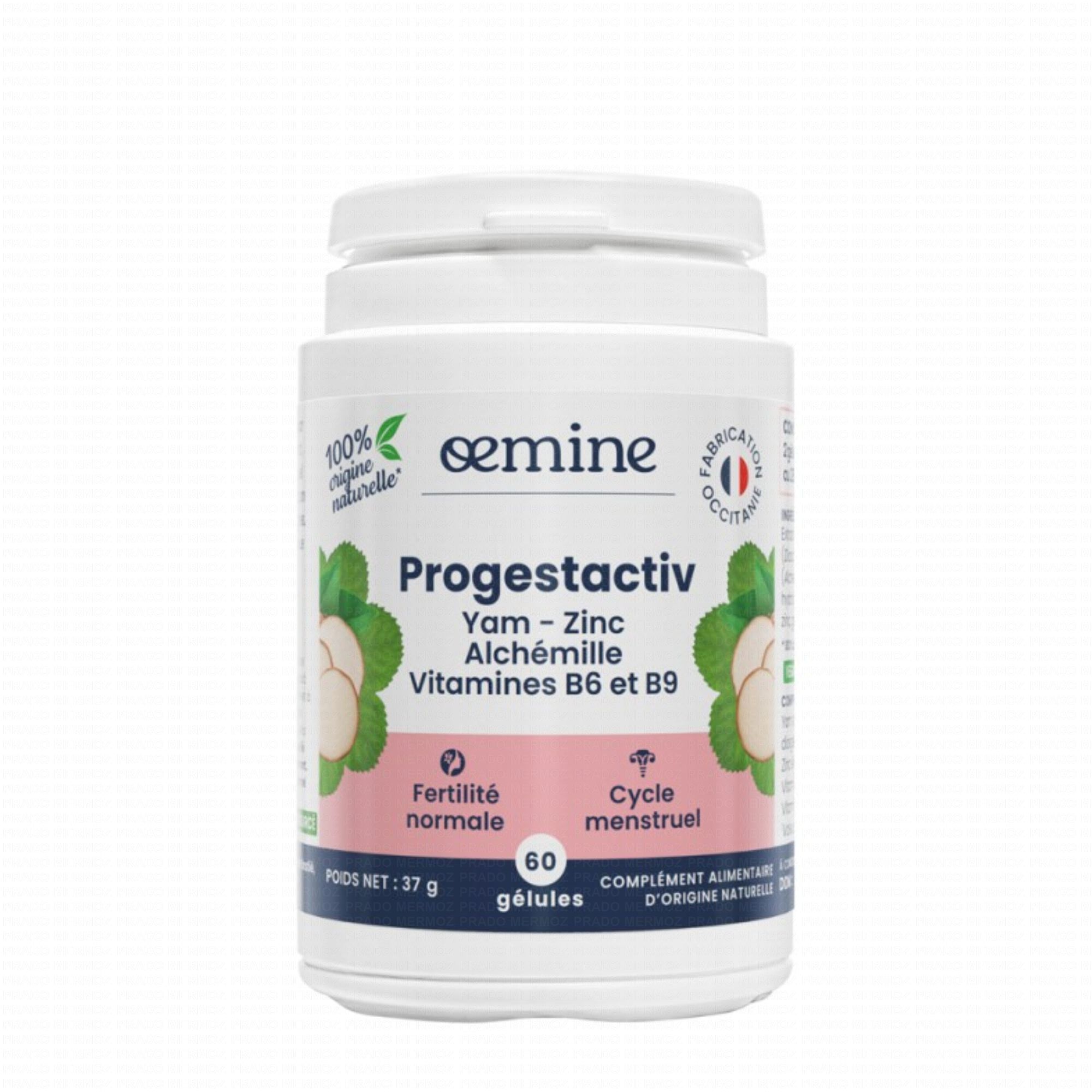 OEMINE Progestactiv bio x60 gélules est un complément alimentaire qui contribue au confort avant et pendant le cycle menstruel grâce à la présence d'Alchémille. Le Yam aide à apaiser les signes de la ménopause et le Zinc favorise la protection des cellules contre le stress oxydatif.