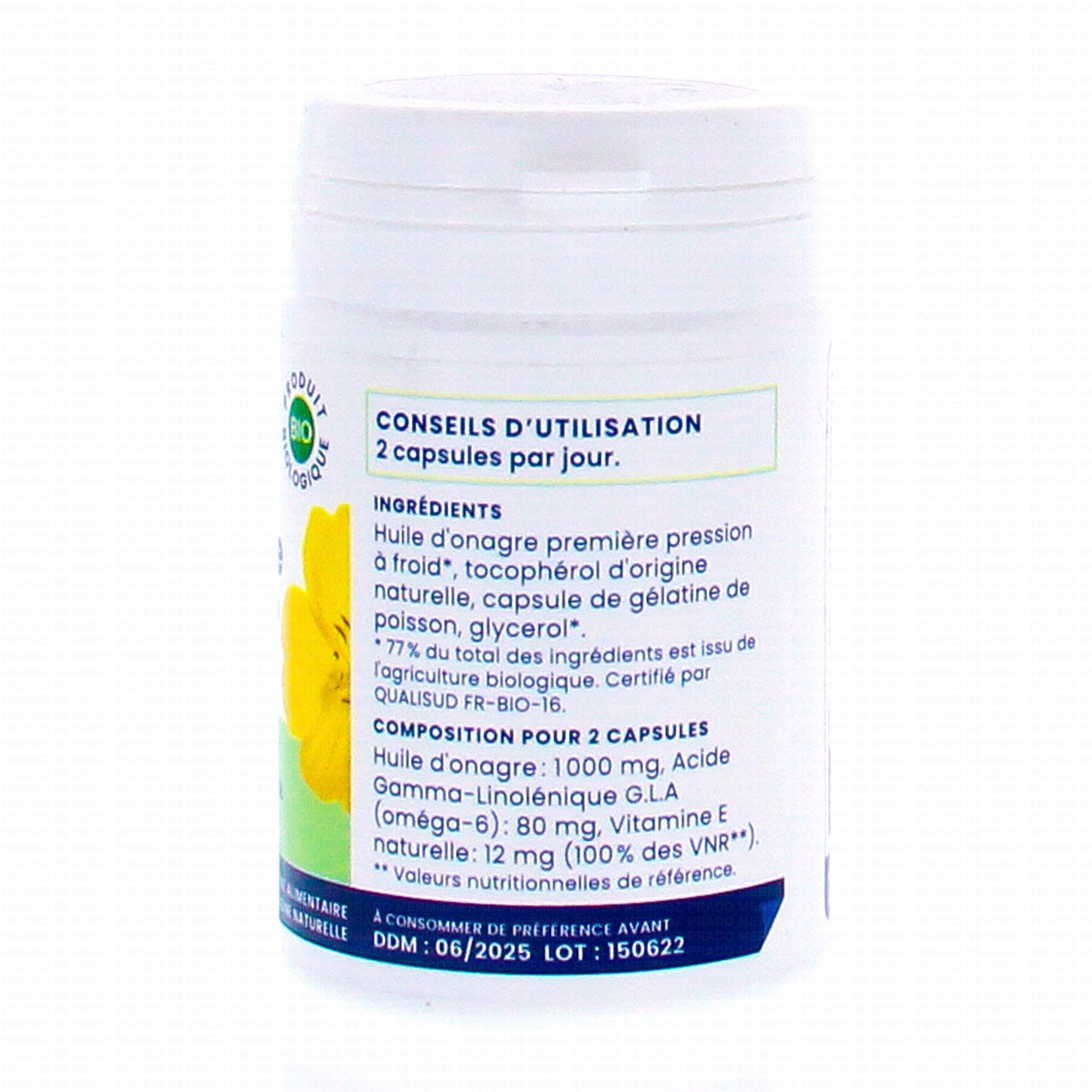 huile d'onagre biologique, capsule de gélatine de poisson biologique, vitamine E naturelle.