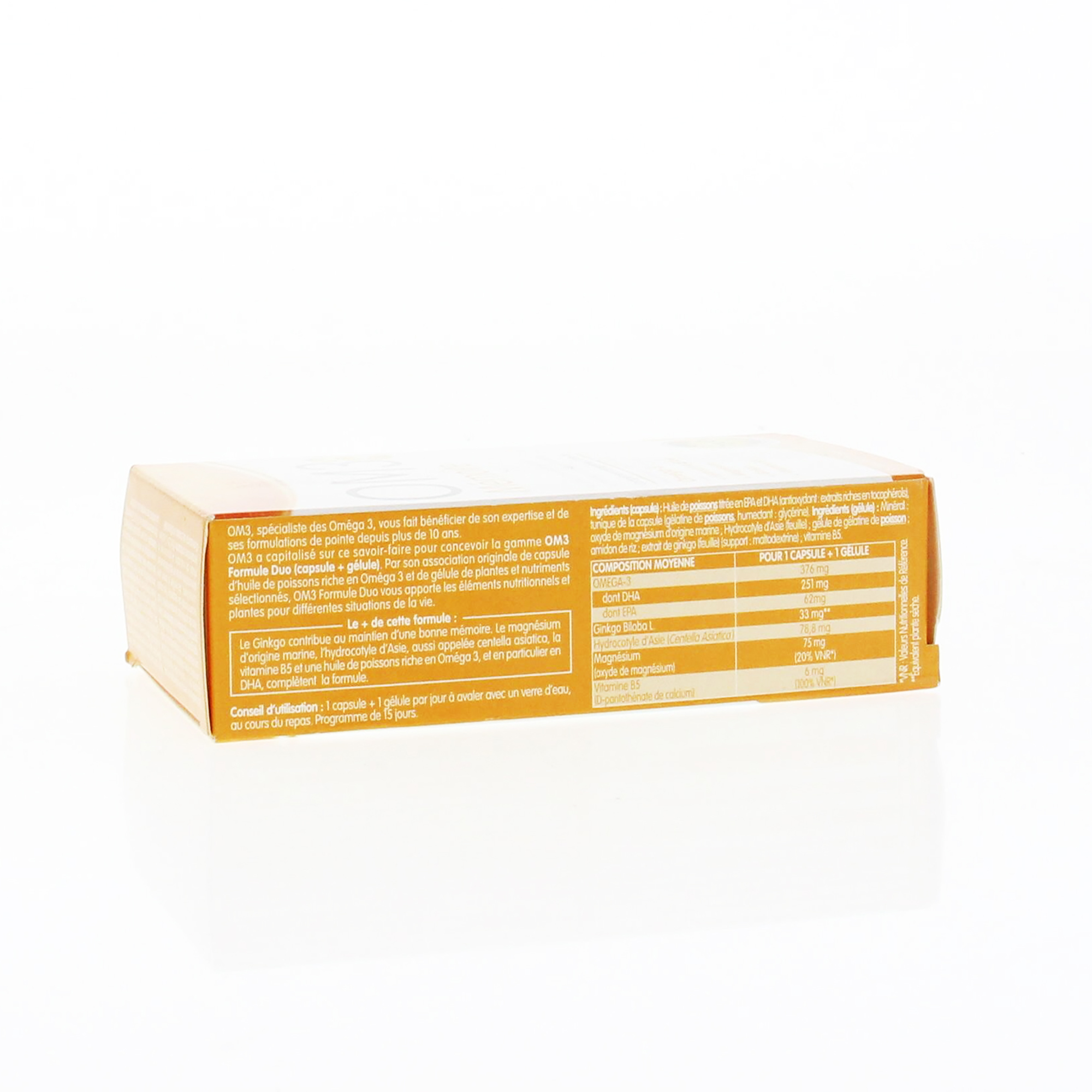 Composition moyenne ( pour 1 capsule + 1 gélule ): Omega-3: 376mg dont DHA: 251mg dont: EPA 62mg ; gingko bilobé L: 33mg** ; hydrocolyte d'asie (centella asiatica): 78.8mg ; magnésium (oxyde de magnésium): 75mg (20% VNR*) ; vitamine B5 (D-pantothénate de calcium): 6mg (100% des VNR*)