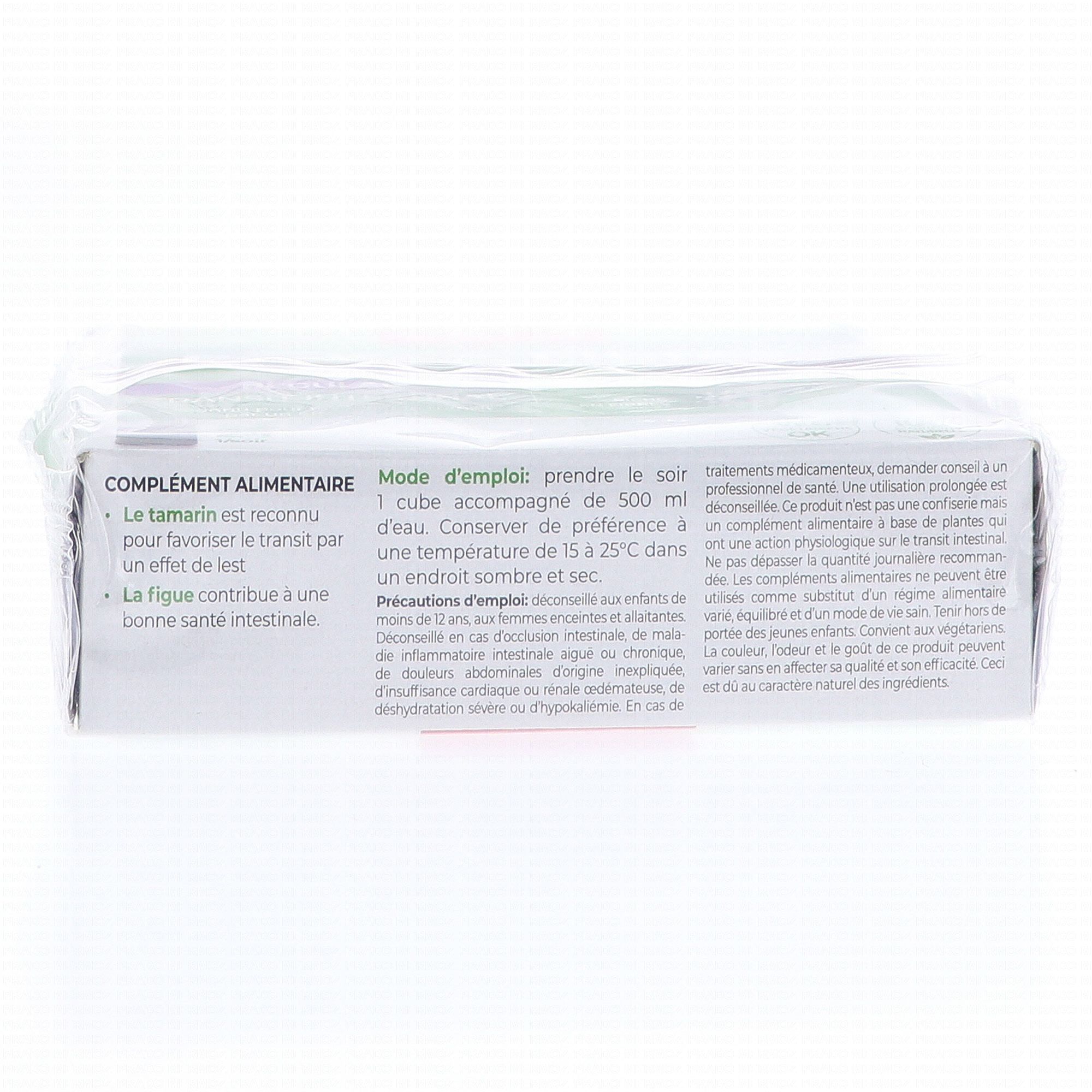 Figues (Ficus carica L. – 7,44 g/cube), sirop de blé (sans gluten); ingrédient alimentaire ayant des propriétés aromatisantes: rhubarbe (Rheum palmatum L./Rheum officinale Baill., sirop de blé (sans gluten)); humectant: glycérine; gomme de guar (Cyamopsis tetragonolobus (L.) Taub. – 400 mg/cube), pulpe de tamarin (Tamarindus indica L. - 400 mg/cube), concentré de dattes (Phoenix dactylifera L. - 200 mg/cube), arôme naturel.