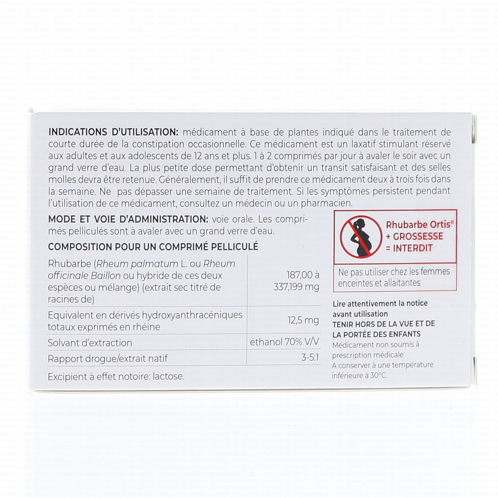 RHUBARBE ORTIS, comprimé pelliculé est un médicament à base de plantes préconisé dans le traitement à court terme de la constipation occasionnelle chez l'adulte et l'adolescent à partir de l'âge de 12 ans.Vous devez vous adresser à votre médecin si vous ne ressentez aucune amélioration ou si vous vous sentez moins bien après 7 jours.