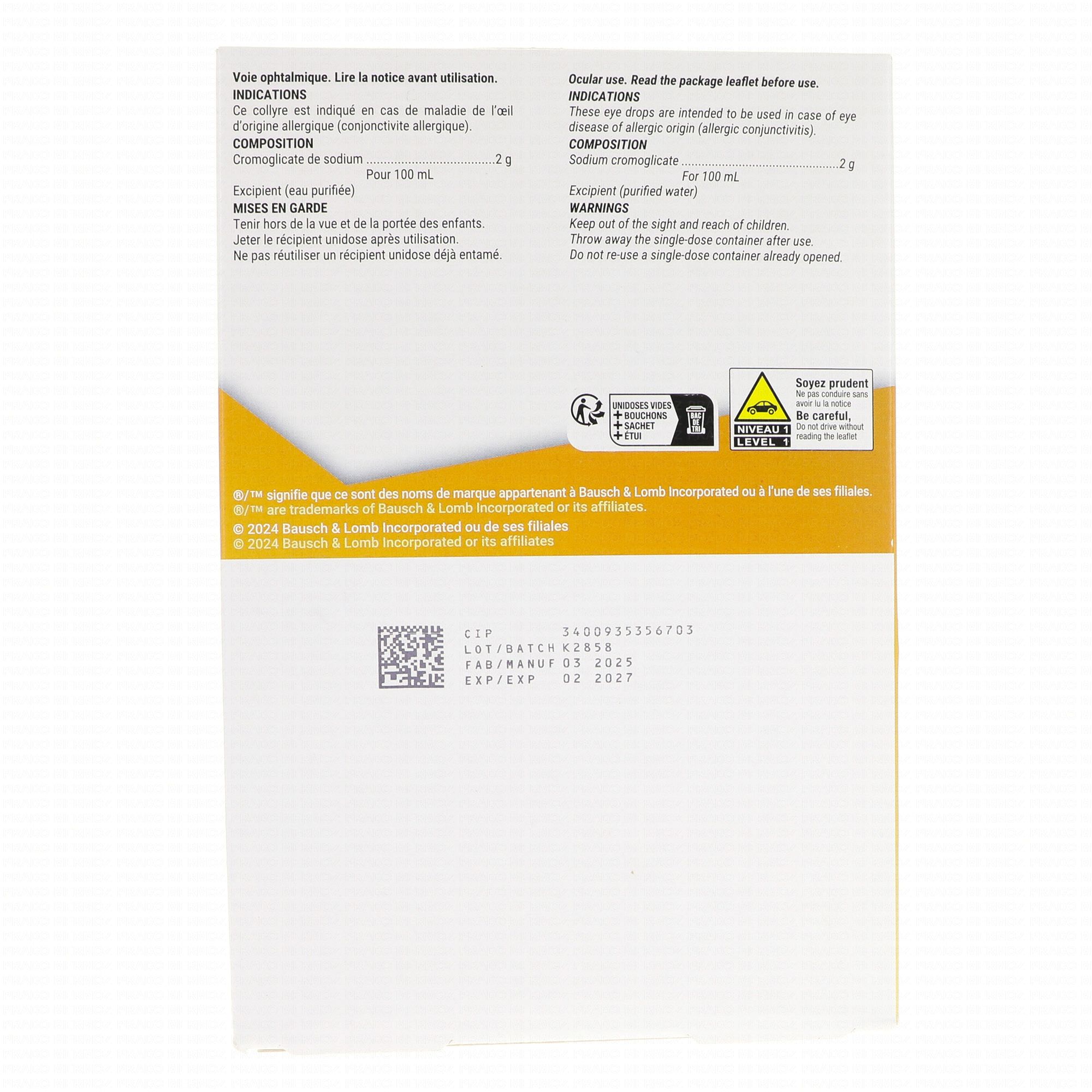 Pour 100 ml : Cromoglicate de sodium 2 g. Liste des excipients : Eau purifiée.