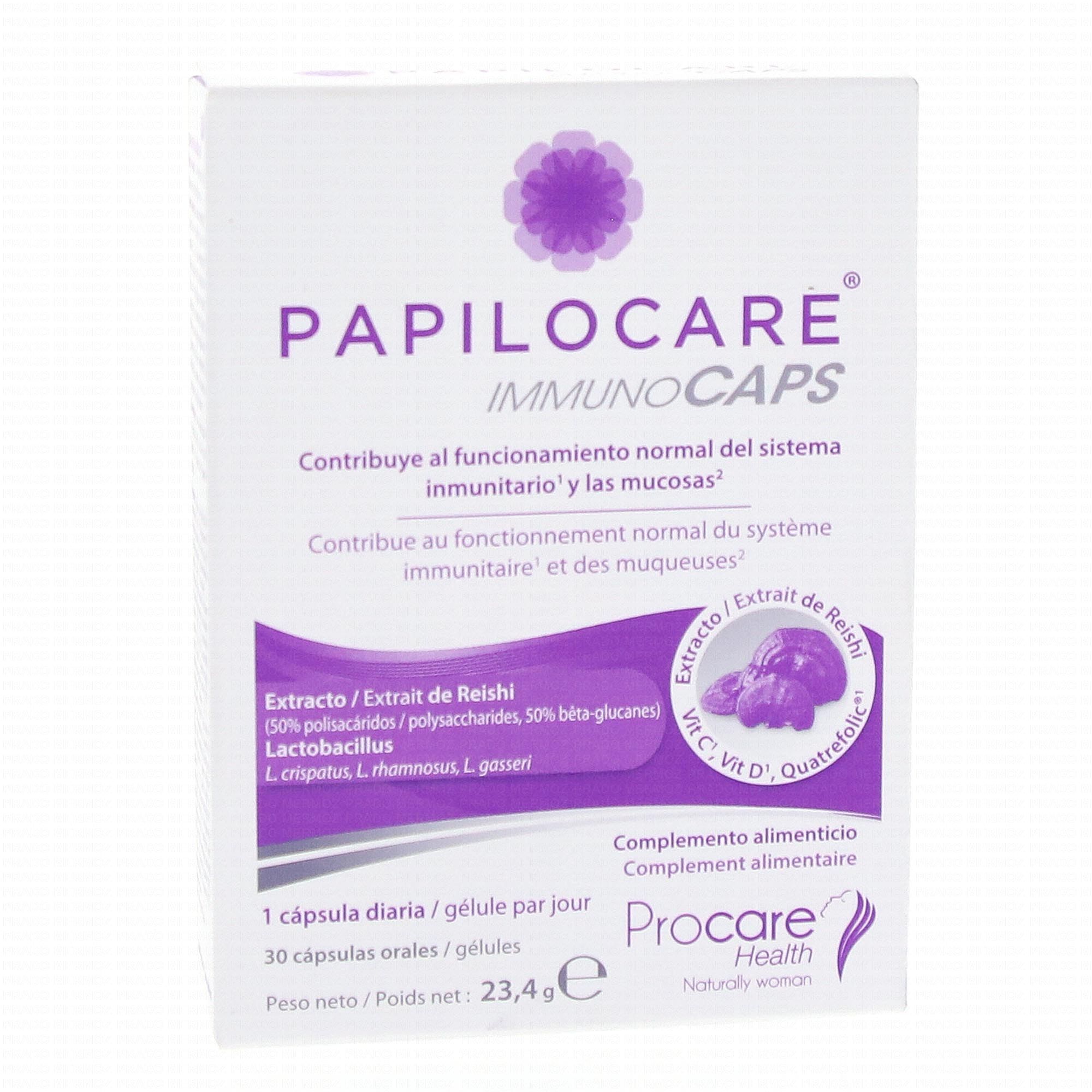 PAPILOCARE ImmunoCaps 30 gélules est un complément alimentaire qui aide à restaurer et à maintenir la microflore vaginale normale grâce à la présence des souches Lactobacillus crispatus, Lactobacillus gasseri, Lactobacillus rhamnosus. La vitamine C, le Cuivre et le Zinc contribuent à renforcer le système immunitaire. La vitamine B3 favorise le maintien de muqueuses normales.