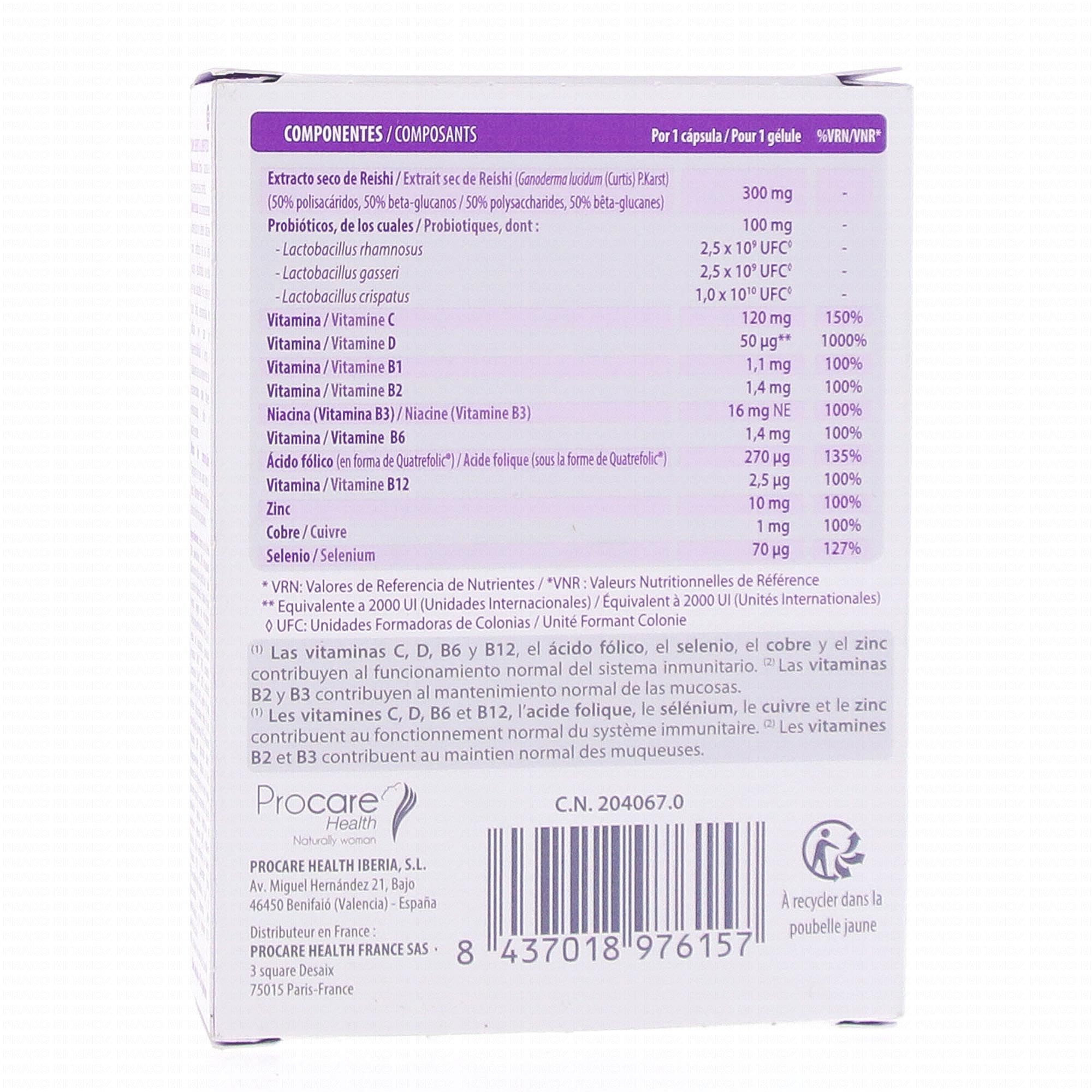 Extrait sec de reishi (50 % polysaccharides, 50 % bêta-glucanes) (Ganoderma lucidum (Curtis) P. Karst) ; gélule d'origine végétale (Agent d'enrobage : hydroxypropyl méthyl cellulose, colorant d'origine naturelle : jus de carotte violette) ; acide L-ascorbique (vitamine C) ; mélange de 3 souches de lactobacilles (Lactobacillus crispatus : 1.0 x 1010 UFC* ; Lactobacillus rhamnosus : 2.5 x 109 UFC* ; Lactobacillus gasseri : 2.5 x 109 UFC*) ; agent de charge : cellulose microcrystalline ; citrate de zinc ; cholecalciferol (vitamine D3) ; nicotinamide (vitamine B3) ; anti-agglomérants : dioxyde de silicium, sels de magnésium d'acides gras d'origine végétale ; gluconate de cuivre ; chlorhydrate de pyridoxine (vitamine B6) ; riboflavine (vitamine B2) ; chlorhydrate de thiamine (vitamine B1) ; Quatrefolic (acide ((6S)-5-méthyltétrahydrofolique sous forme de sel de glucosamine) (vitamine B9) ; méthylcobalamine 1 % (vitamine B12) ; sélénite de sodium