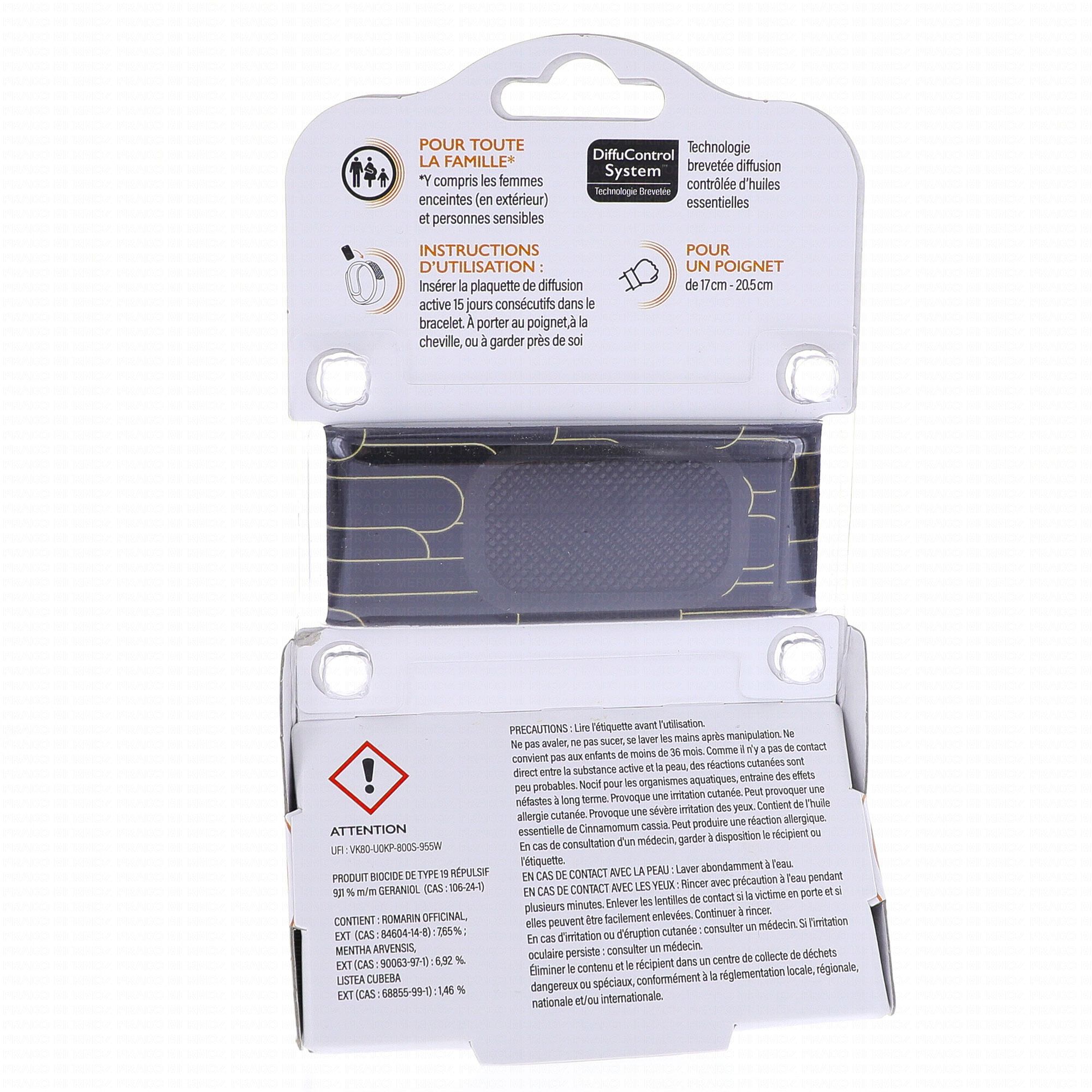 Insérer la plaquette de diffusion active 15 jours consécutifs dans le bracelet. À porter au poignet, à la cheville, ou à garder près de soi. Se laver les mains après manipulation. Ne pas avaler. Ne pas sucer. Ne convient pas aux enfants de moins de 36 mois. Comme il n'y a pas de contact direct entre la substance active et la peau, des réactions cutanées sont peu probables. Provoque une irritation cutanée. Peut provoquer une allergie cutanée. Provoque une sévère irritation des yeux. Peut provoquer une réaction allergique. En cas de contact avec la peau : laver abondamment à l'eau. En cas d'irritation ou d'éruption cutanée : consulter un médecin. En cas de contact avec les yeux : rincer avec précaution à l'eau pendant plusieurs minutes. Enlever les lentilles de contact si la victime en porte et si elles peuvent être facilement enlevées. Continuer à rincer. Si l'irritation oculaire persiste : consulter un médecin. Contient de l'huile essentielle de Cinnamomum cassia. Nocif pour les organismes aquatiques, entraine des effets néfastes à long terme. Éliminer le contenu et le récipient dans un centre de collecte de déchets dangereux ou spéciaux conformément à la réglementation locale, régionale, nationale et/ou internationale.