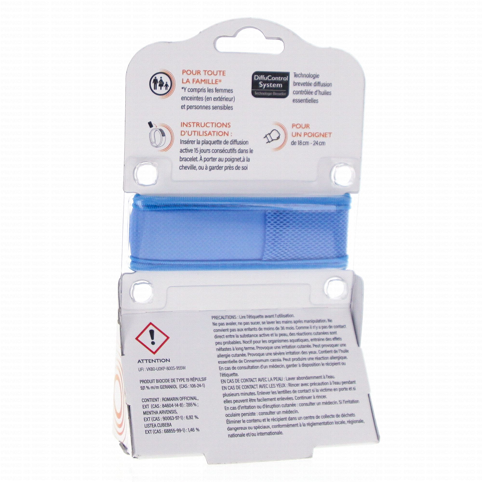 Insérer la plaquette de diffusion active 15 jours consécutifs dans le bracelet. À porter au poignet, à la cheville, ou à garder près de soi. Se laver les mains après manipulation. Ne pas avaler. Ne pas sucer. Ne convient pas aux enfants de moins de 36 mois. Comme il n'y a pas de contact direct entre la substance active et la peau, des réactions cutanées sont peu probables. Provoque une irritation cutanée. Peut provoquer une allergie cutanée. Provoque une sévère irritation des yeux. Peut provoquer une réaction allergique. En cas de contact avec la peau : laver abondamment à l'eau. En cas d'irritation ou d'éruption cutanée : consulter un médecin. En cas de contact avec les yeux : rincer avec précaution à l'eau pendant plusieurs minutes. Enlever les lentilles de contact si la victime en porte et si elles peuvent être facilement enlevées. Continuer à rincer. Si l'irritation oculaire persiste : consulter un médecin. Contient de l'huile essentielle de Cinnamomum cassia. Nocif pour les organismes aquatiques, entraine des effets néfastes à long terme. Éliminer le contenu et le récipient dans un centre de collecte de déchets dangereux ou spéciaux conformément à la réglementation locale, régionale, nationale et/ou internationale.