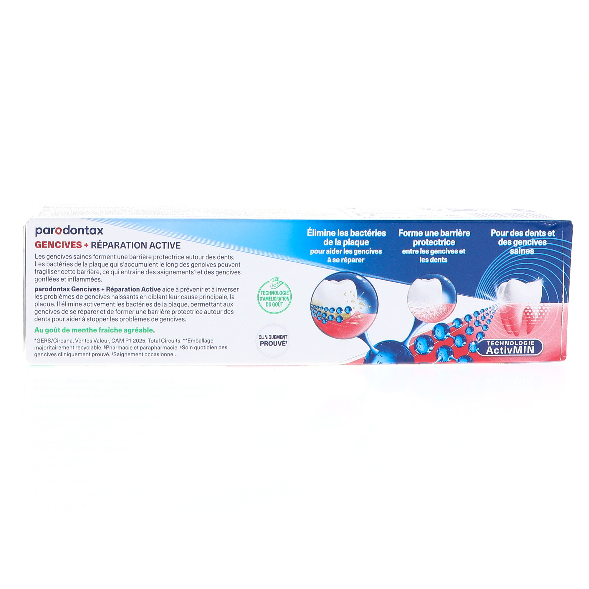Parodontax Réparation Active Gencives 75 ml est un dentifrice quotidien au fluor pour des gencives saines et des dents fortes. Il répare les gencives qui saignent, qui sont gonflées ou inflammées en aidant à prévenir et à inverser les problèmes de gencives naissants en ciblant leur cause principale, la plaque.