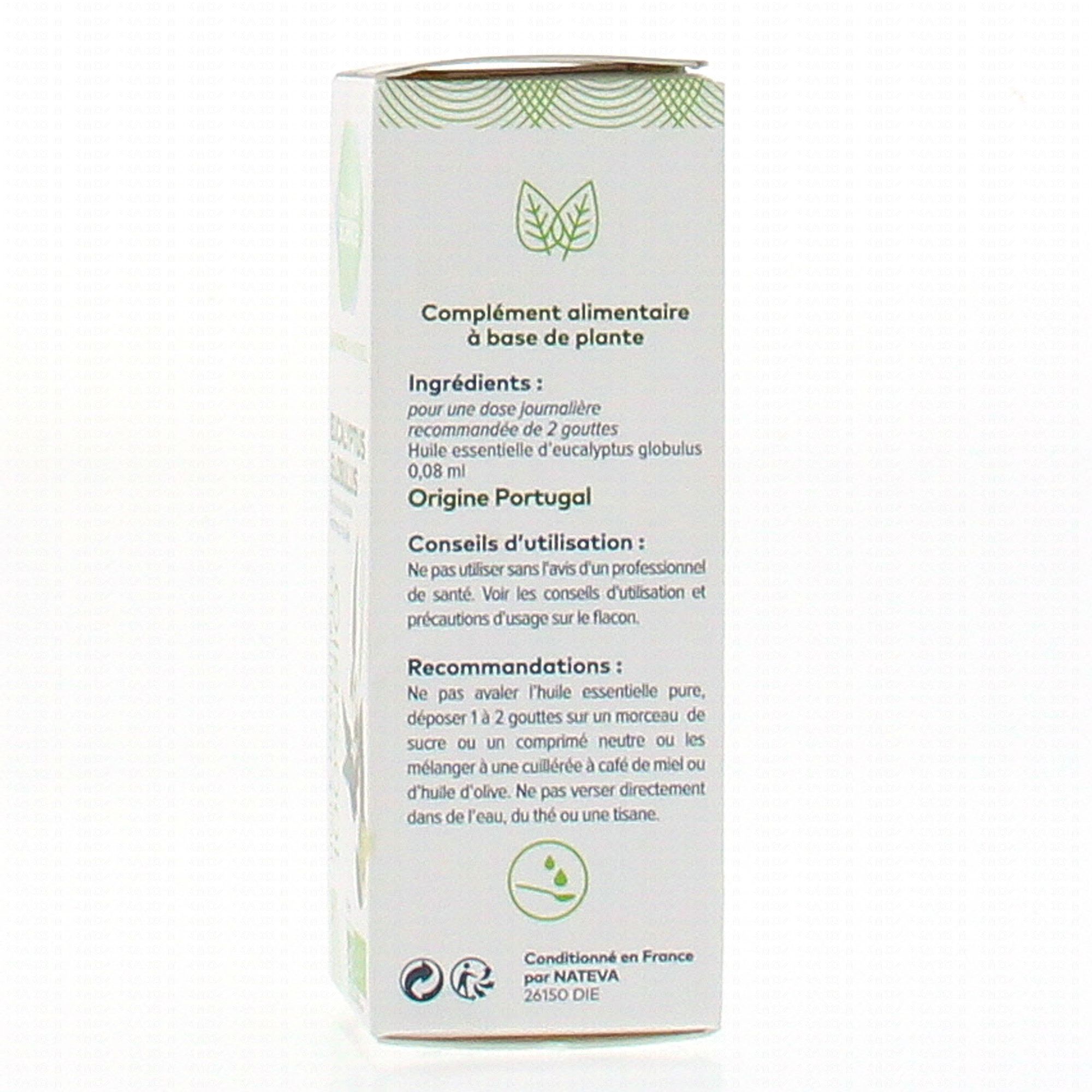 Pour une dose journalière recommandée de 2 gouttes: Huile essentielle d'eucalyptus globulus: 0.08 ml.