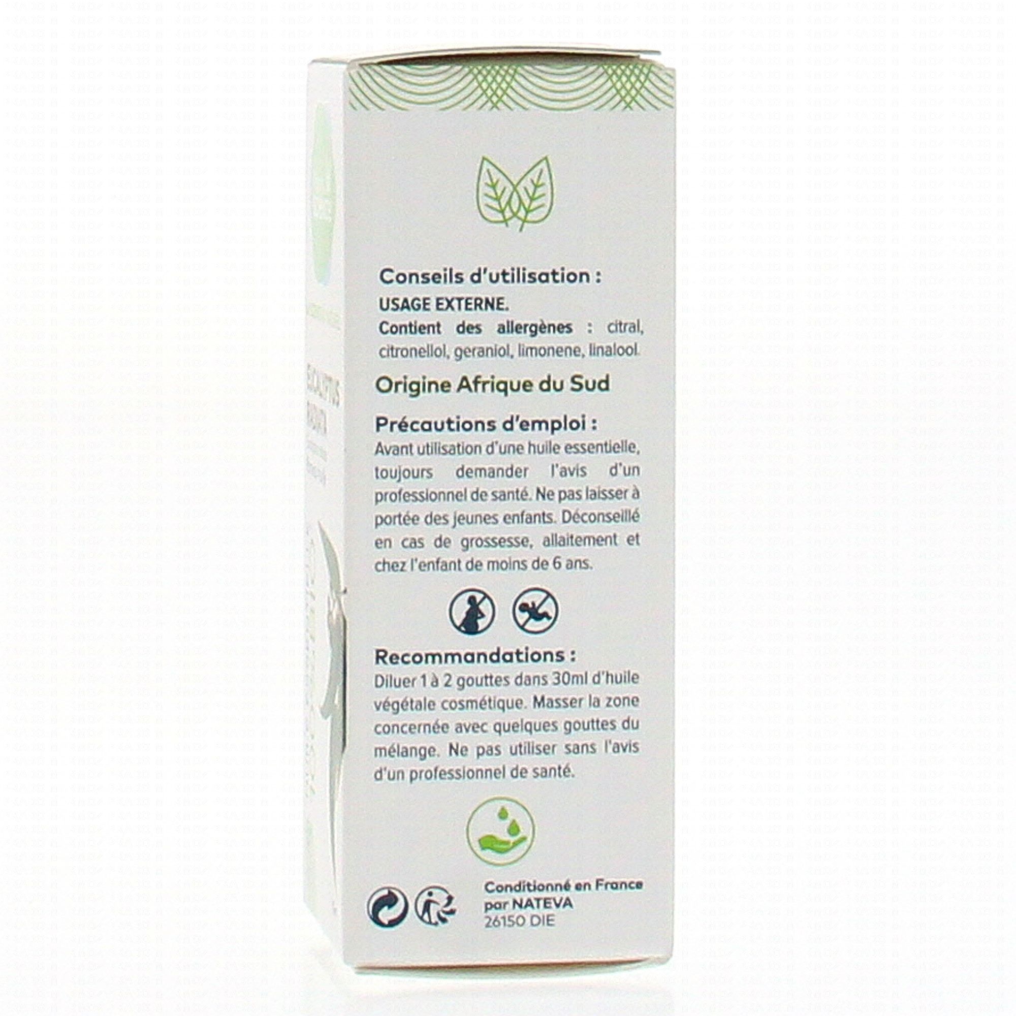 Contient des allergènes : citral, citronellol, geraniol, limonene, linallol.
