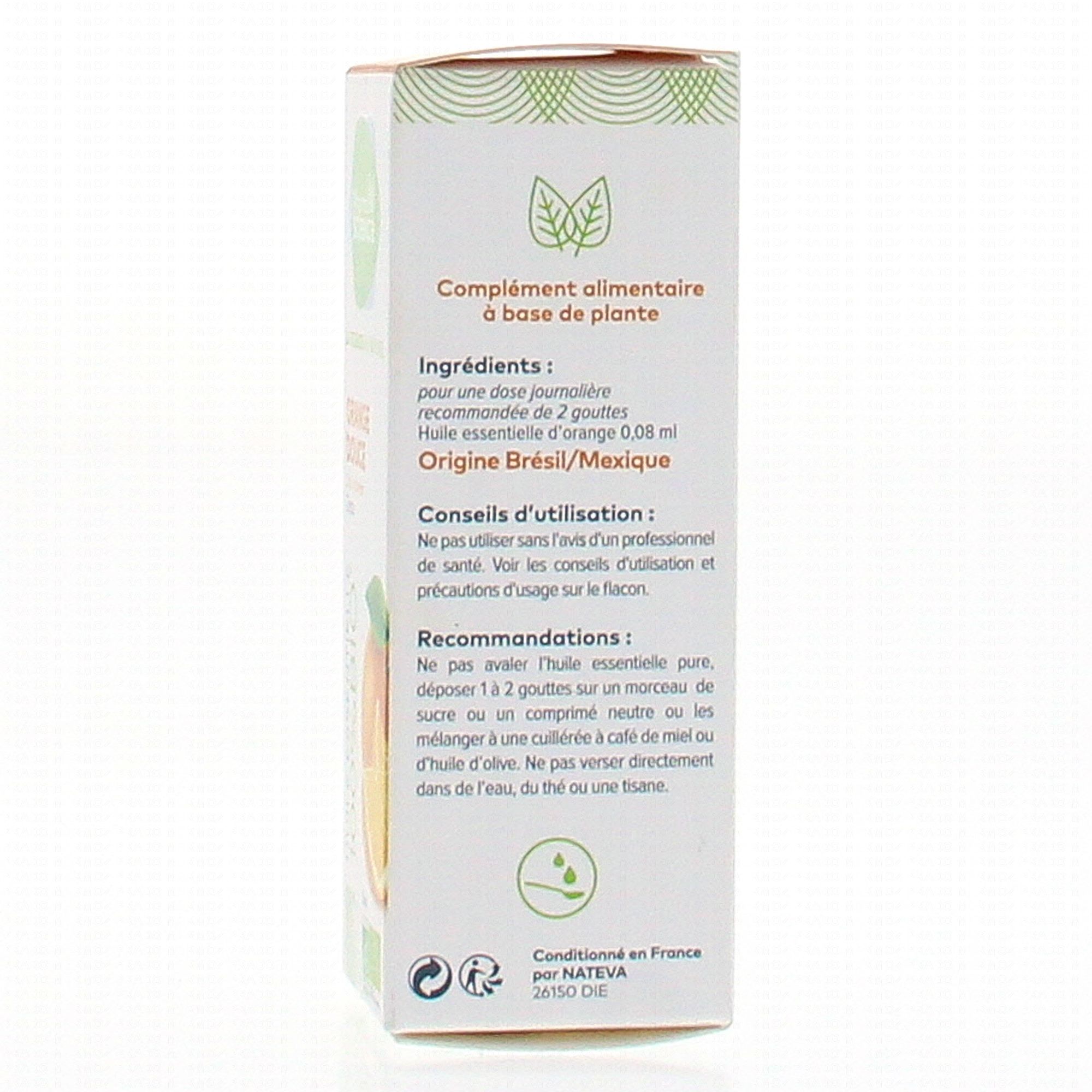 Pour une dose journalière recommandée de 2 gouttes: Huile essentielle d'orange 0.08 ml.