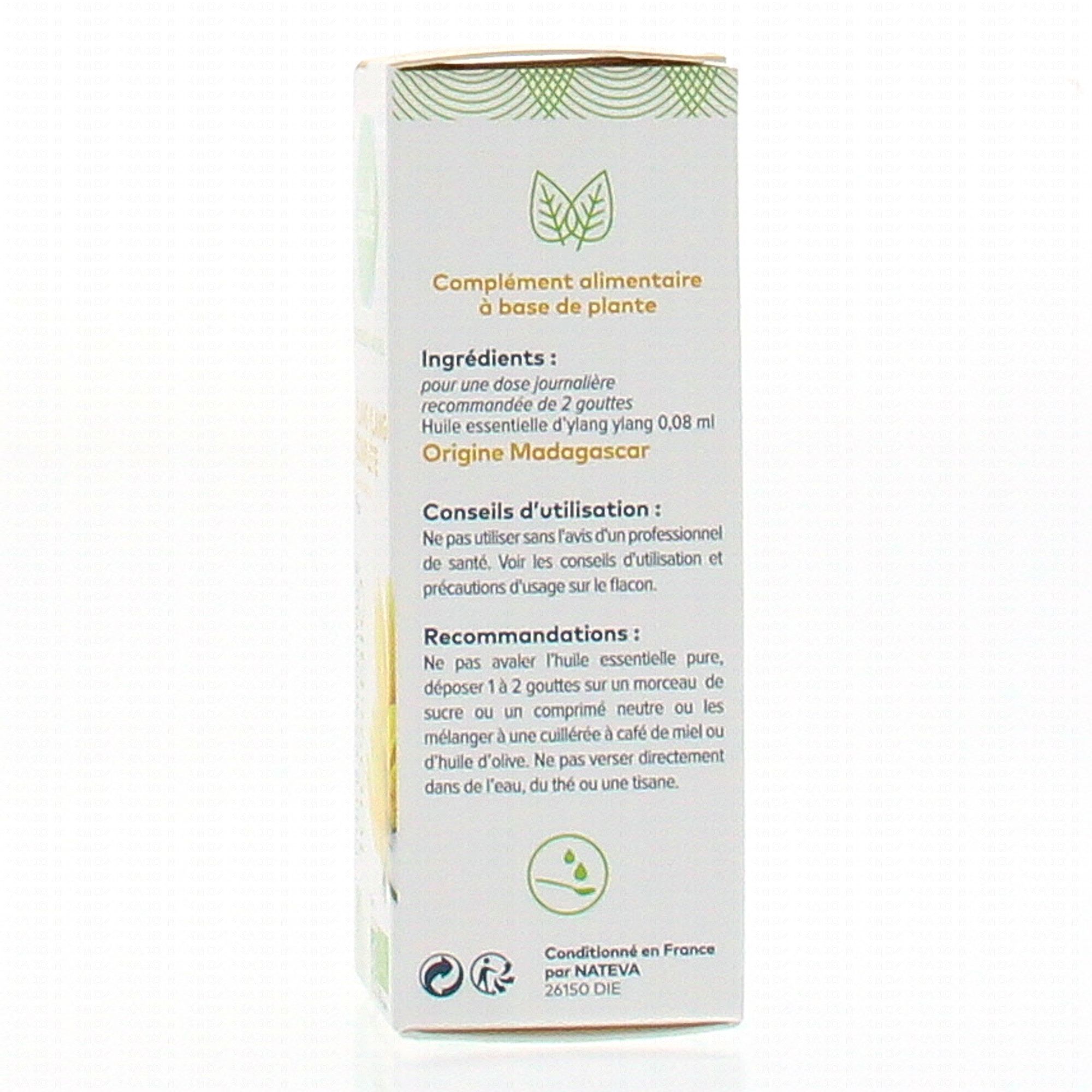 Pour une dose journalière recommandée de 2 gouttes : Huile essentielle d'Ylang ylang 0.08 ml.