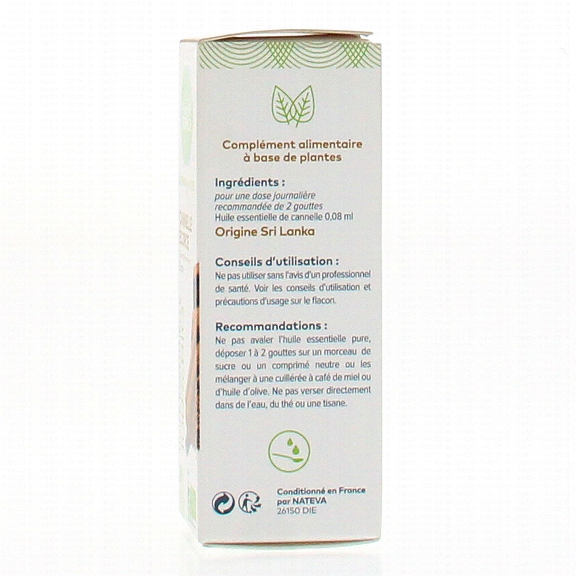 Pour une dose journalière recommandée de 2 gouttes : huiles essentielle de cannelle 0.08 ml.*