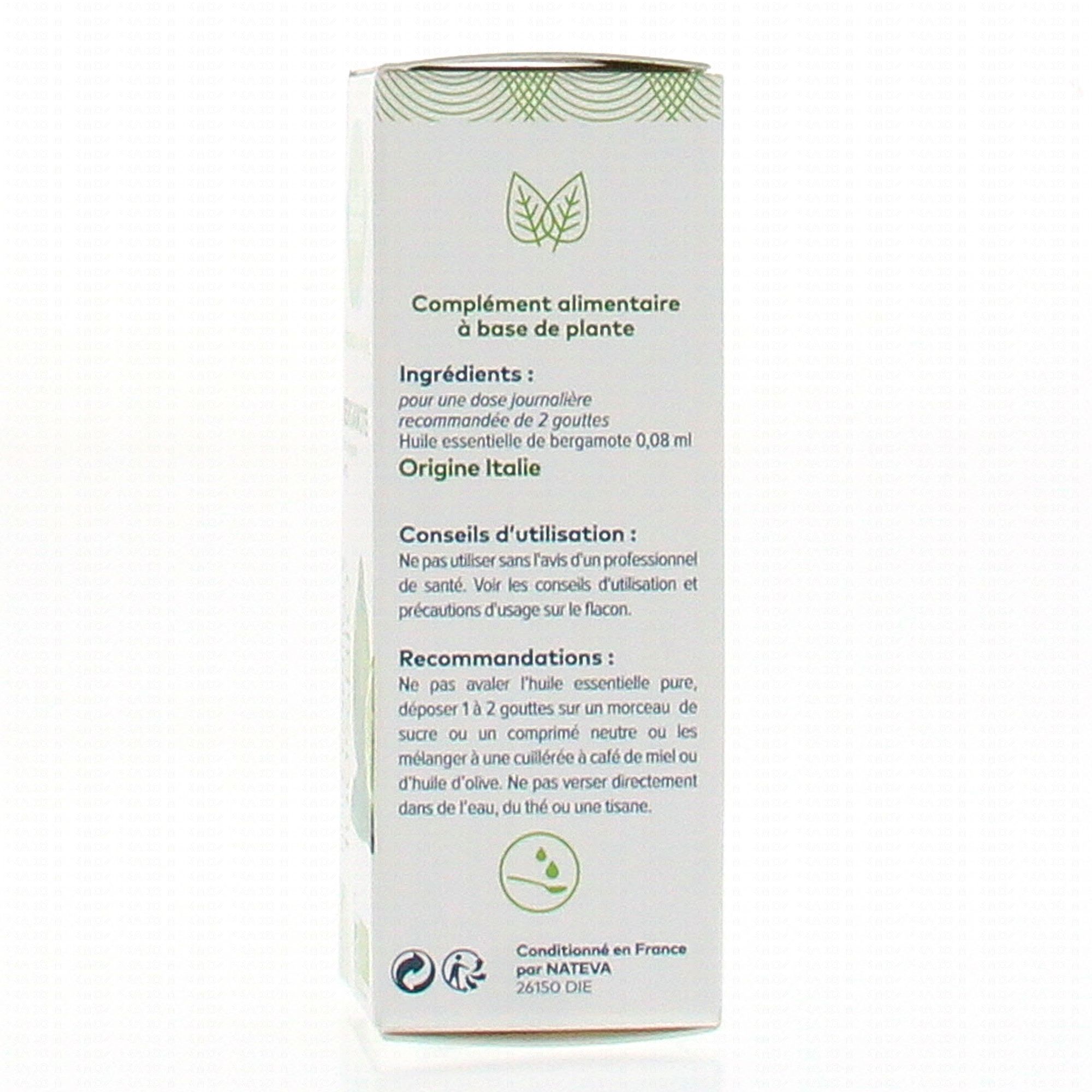Pour une dose journalière recommandée de 2 gouttes: Huile essentielle de bergamote 0.08 ml*.