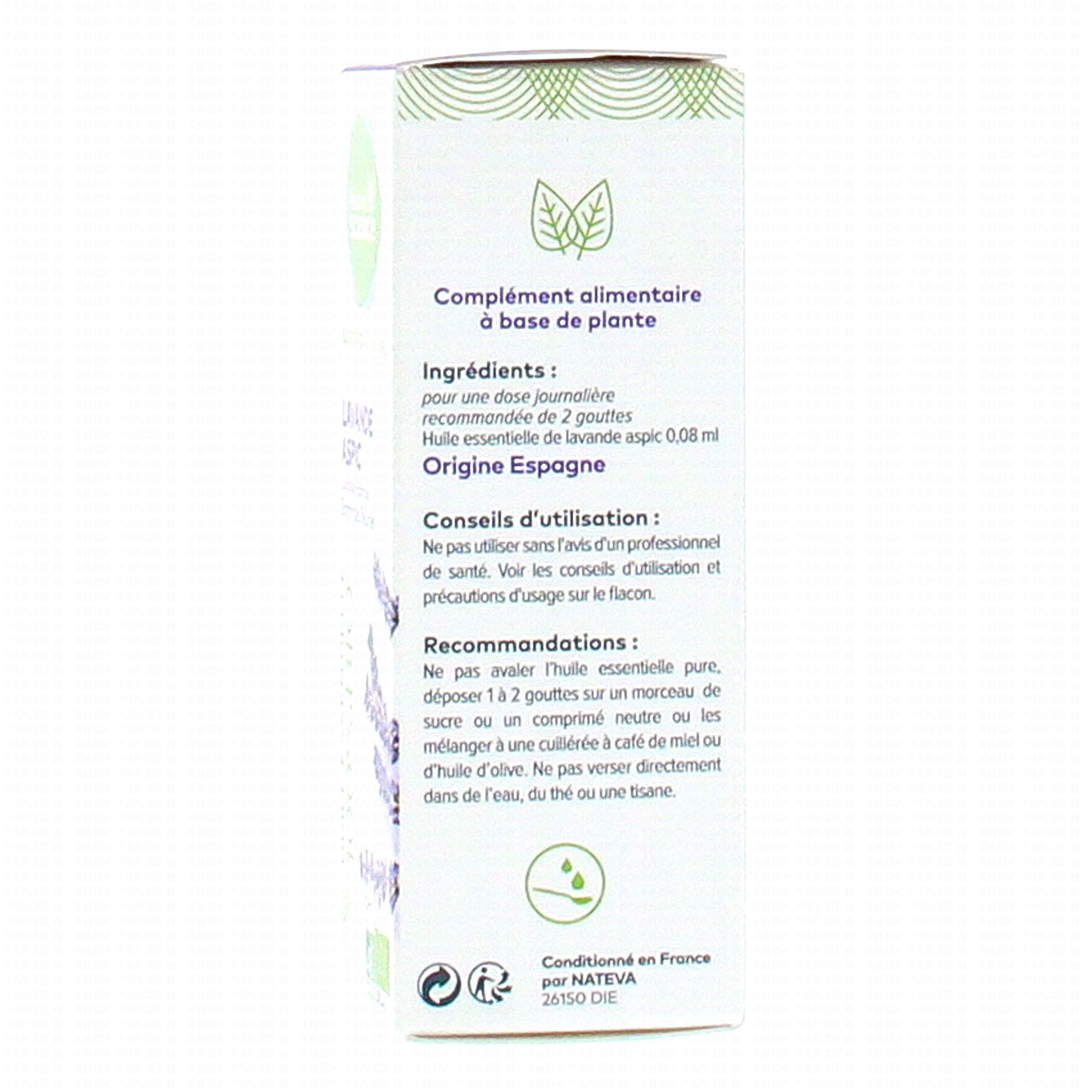 Pour une dose journalière recommandée ( 2 gouttes): Huile essentielle de lavande aspic 0.08 ml *.