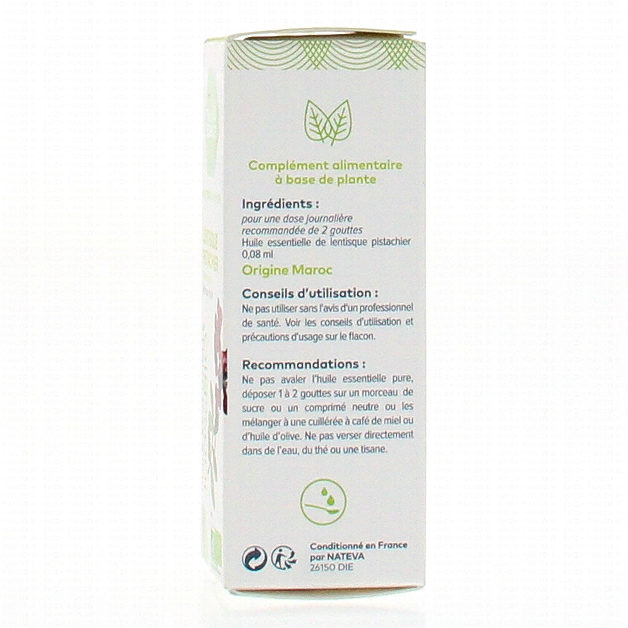 Pour une dose journalière recommandée ( 2 gouttes): huile essentielle de lentisque pistachier 0.08 ml*.
