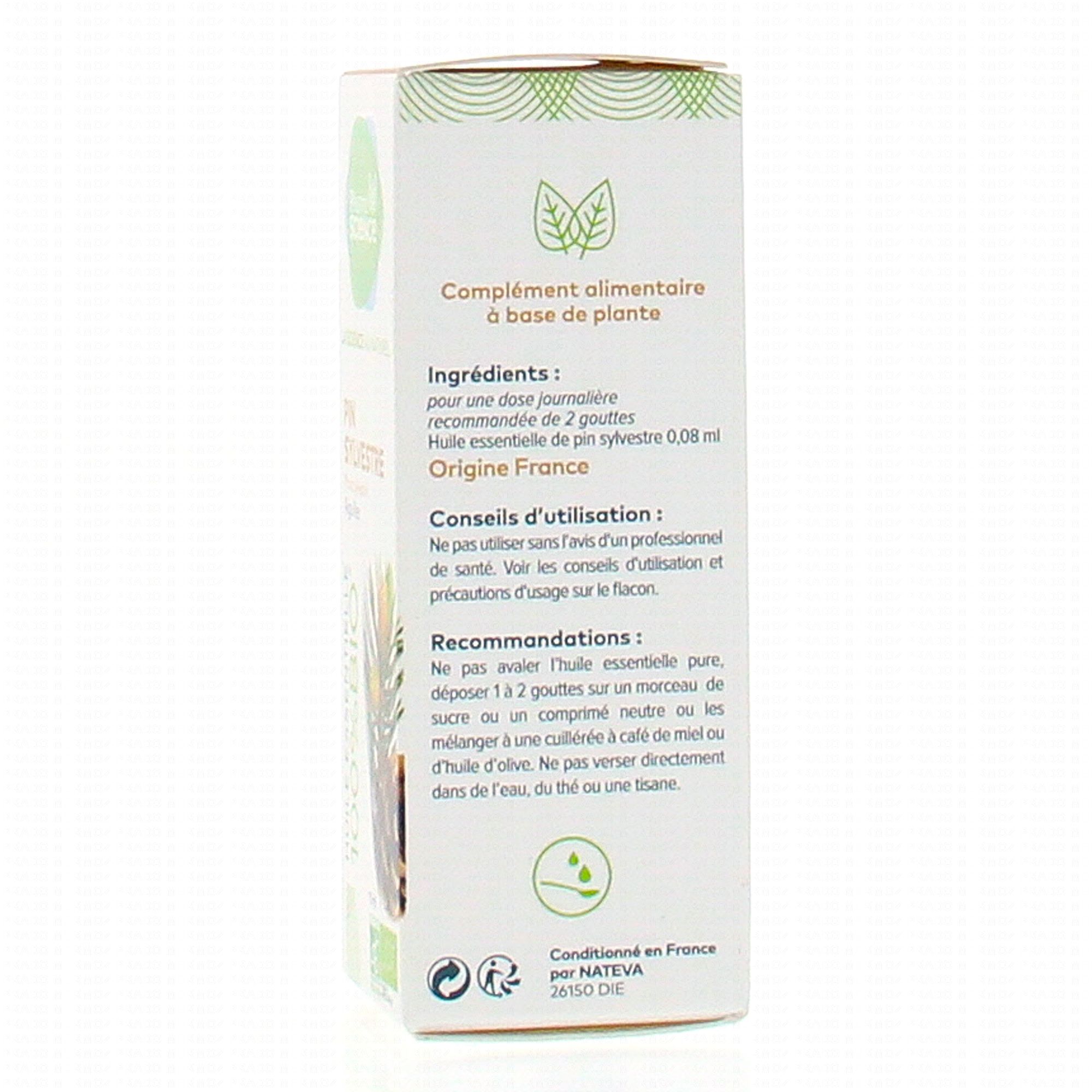 Pour une dose journalière recommandée de 2 gouttes: huile essentielle de pin sylvestre 0.08 ml.*.