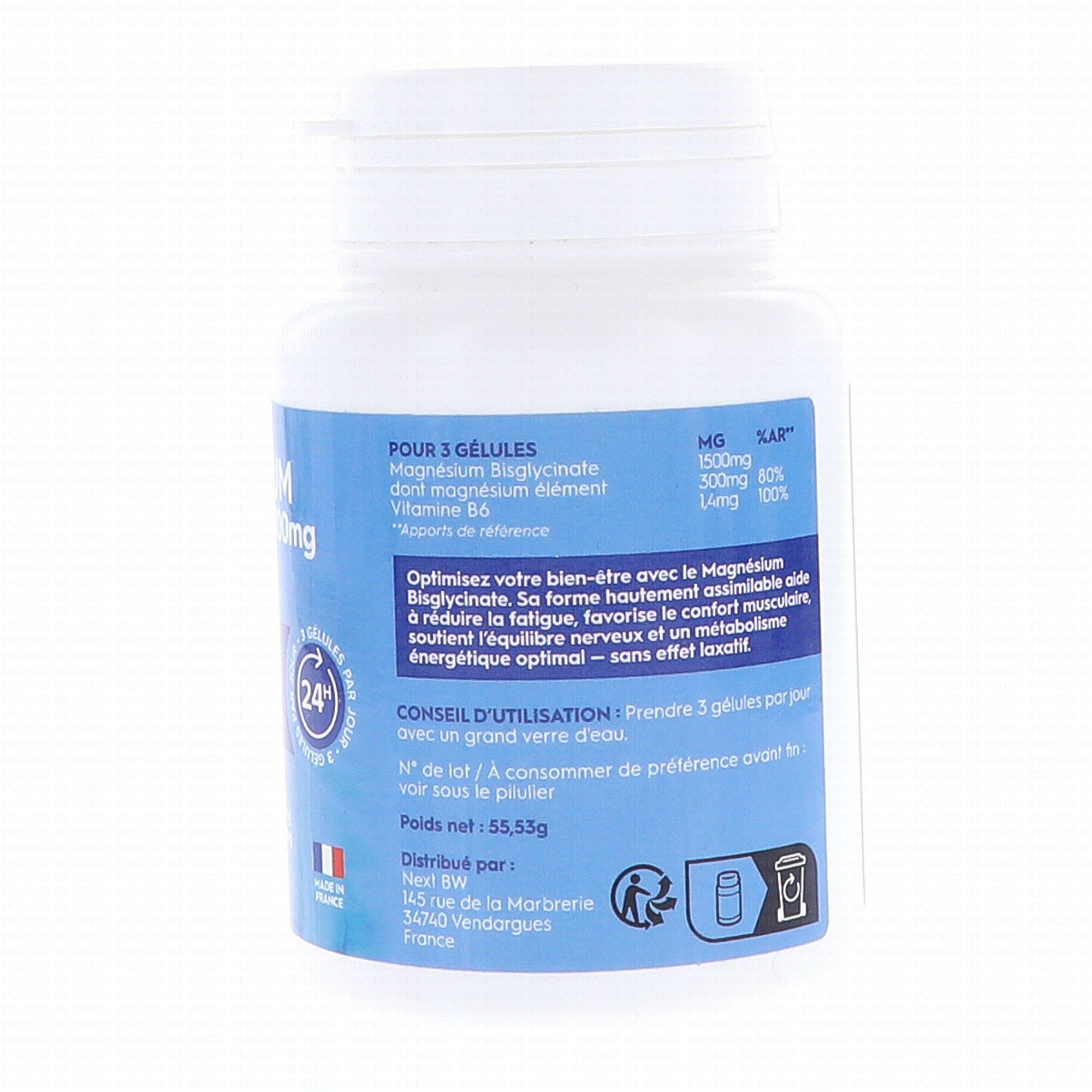 Bisglycinate de magnésium ; Gélule d'origine végétale : Hydroxypropylméthylcellulose ; Agent de charge : Gomme d'acacia ; Antiagglomérant ; Stéarate de magnésium ; Vitamine B6 (Pyridoxine HCL).