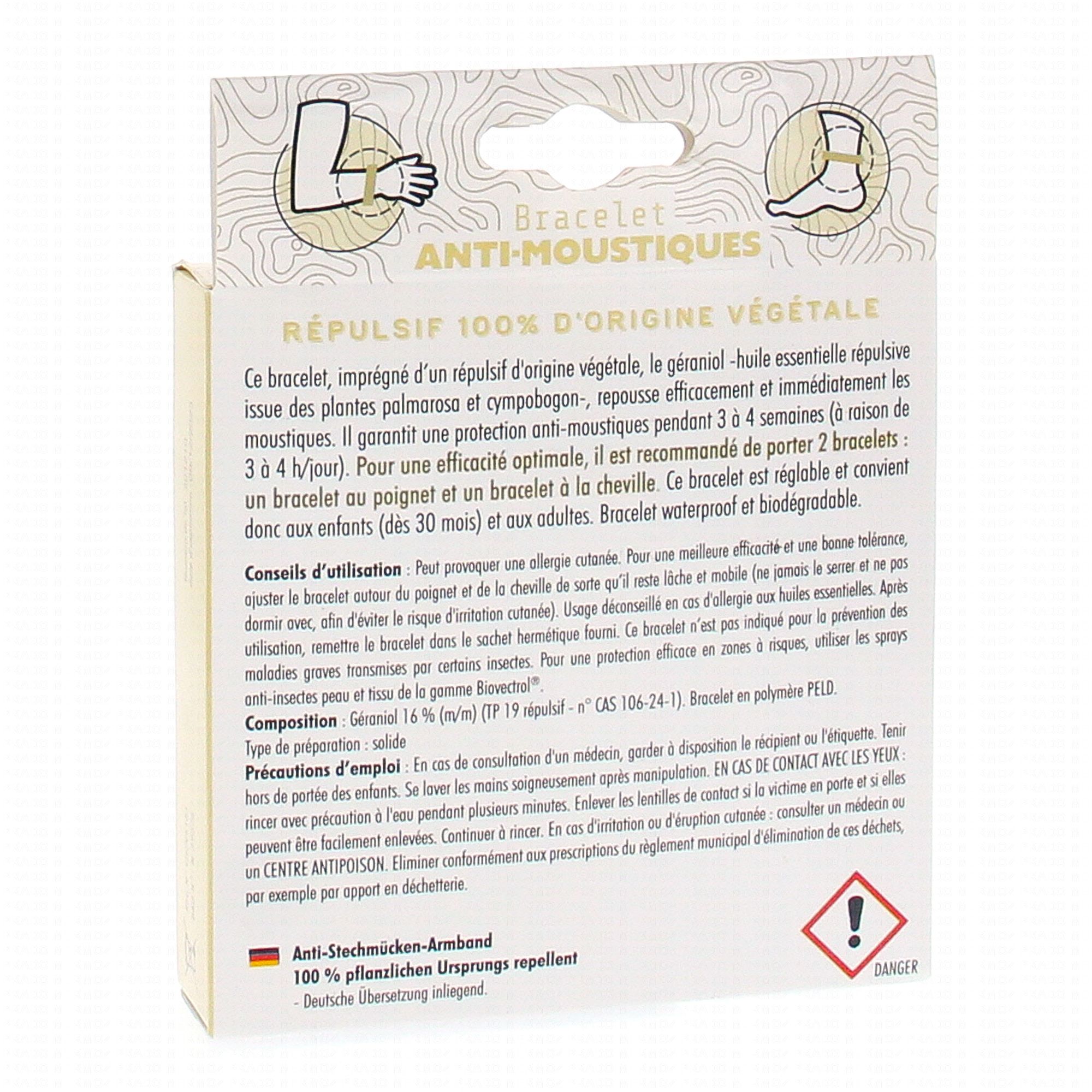 Pour une meilleure efficacité et une bonne tolérance, ajuster le bracelet autour du poignet et de la cheville de sorte qu'il reste lâche et mobile. Après utilisation, remettre le bracelet dans le sachet hermétique fourni. Ce bracelet n'est pas conseillé pour la prévention des maladies graves transmises par certains insectes.