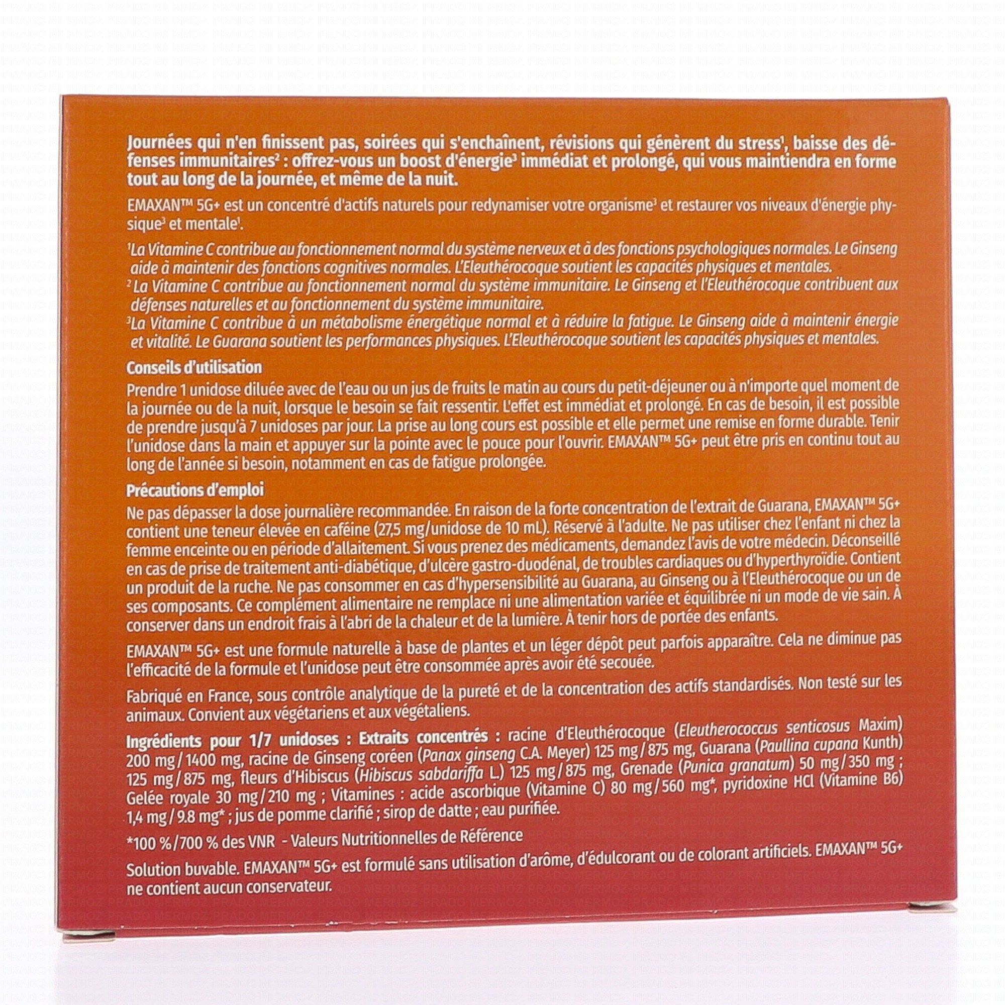 PHYTORESEARCH Emaxan 5G+ - Energie Physique & Mentale - Défenses Immunitaires x7 shots contient les éléments suivants :