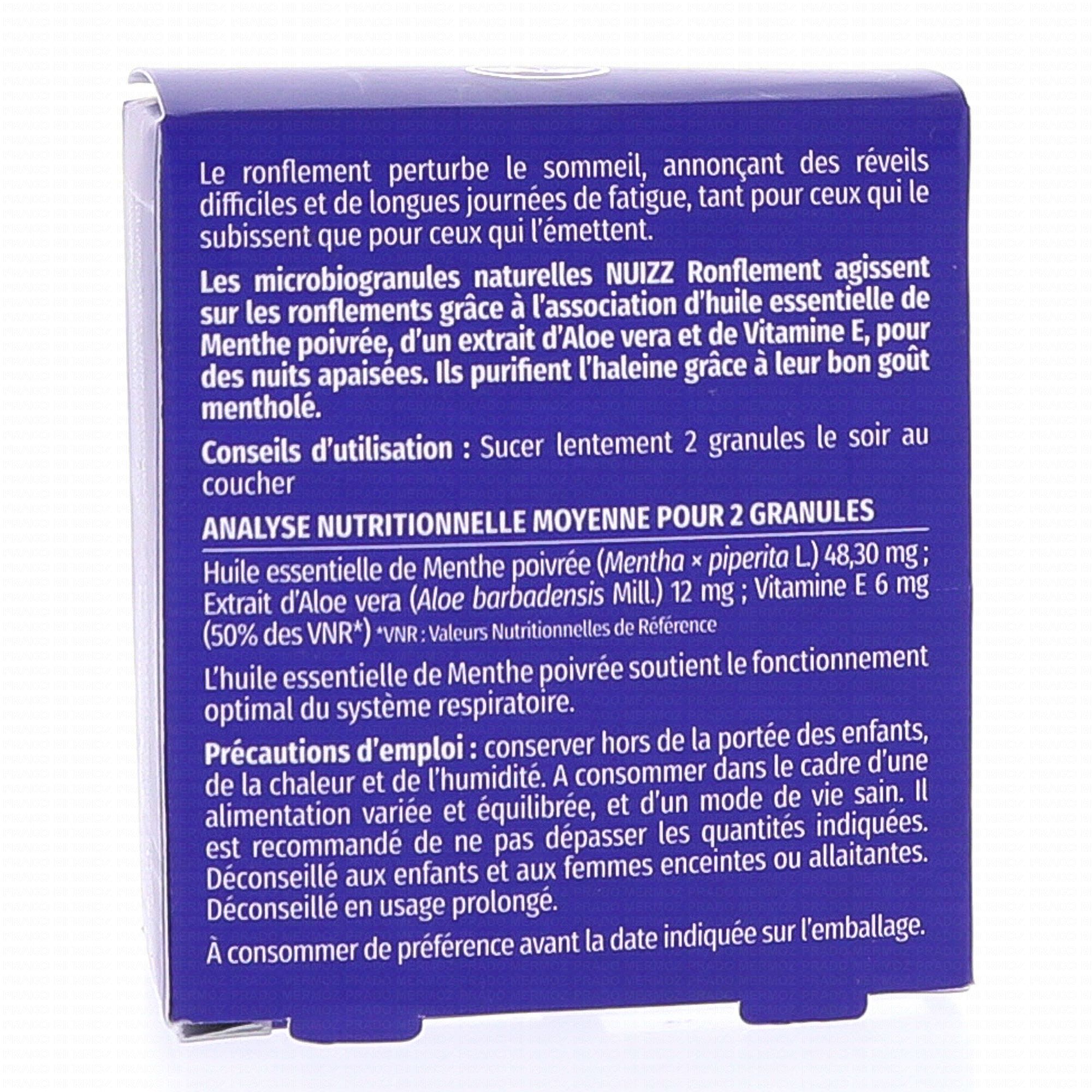 PHYTORESEARCH Nuizz - Micro Biogranules Ronflement est un complément alimentaire sous forme de microgranules à sucer avant le coucher à base d'huile essentielle de menthe poivrée, d'aloe vera et de vitamine E. La menthe poivrée participe à un sommeil de qualité et procure un effet apaisant et agréable sur la gorge, le pharynx et les cordes vocales