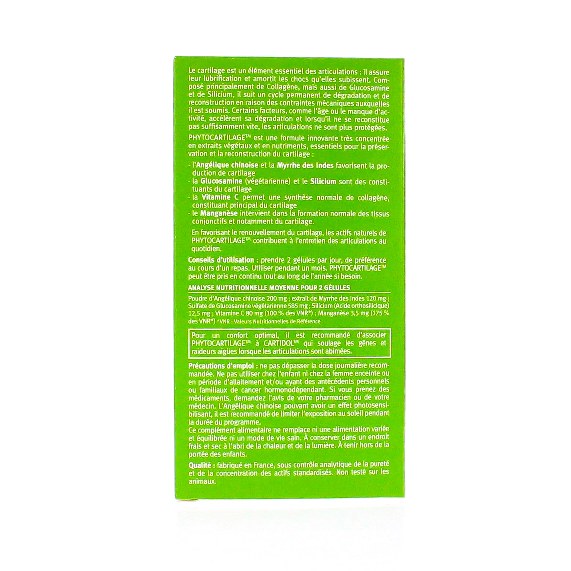 Analyse nutritionnelle moyenne pour 2 gélules: poudre d'Angélique chinoise 200 mg ; extait de Myrrhe des indes 120 mg ; sulfate de glucosamine végétarienne 585mg ; silicium (acide orthosilicique) 12.5mg ; vitamine C 80mg ( 100% des VNR*) ; manganèse 3.5mg ( 175% des VNR*).