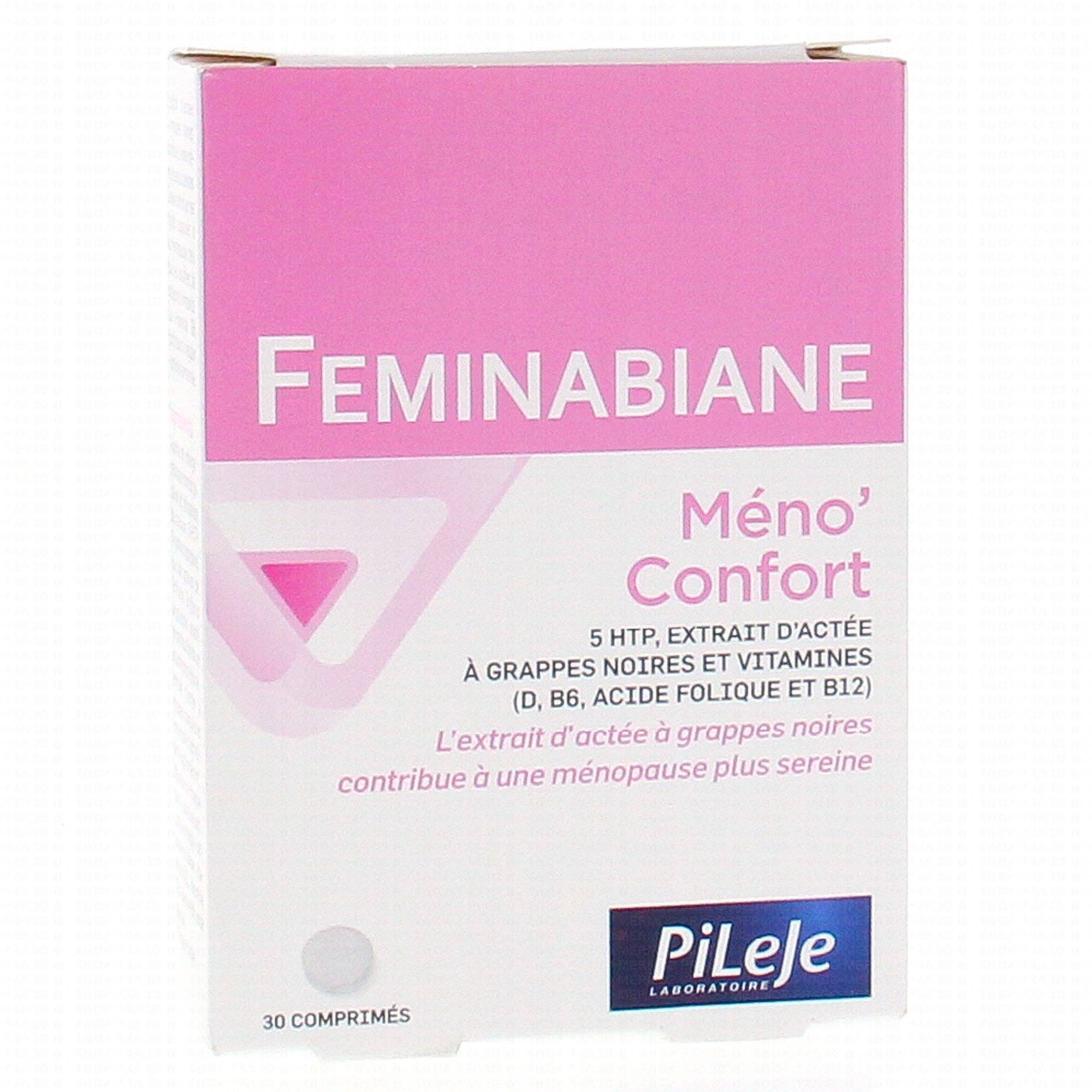 PILEJE Feminabiane Méno'Confort 30 comprimés est un complément alimentaire à base d'extraits végétaux de rhodiole et d'actée à grappes noires et de vitamine B6 Pour les bien être de la femme au cours de la ménopause.