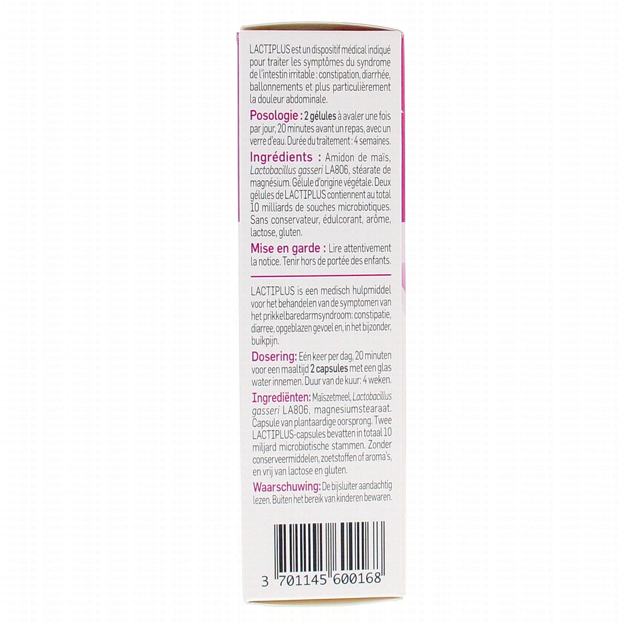 Amidon de maïs, Lactobacillus gasseri LA806, stéarate de magnésium. Gélule d'origine végétale. Deux gélules de LACTIPLUS contiennent au total 10 milliards de souches microbiotiques.