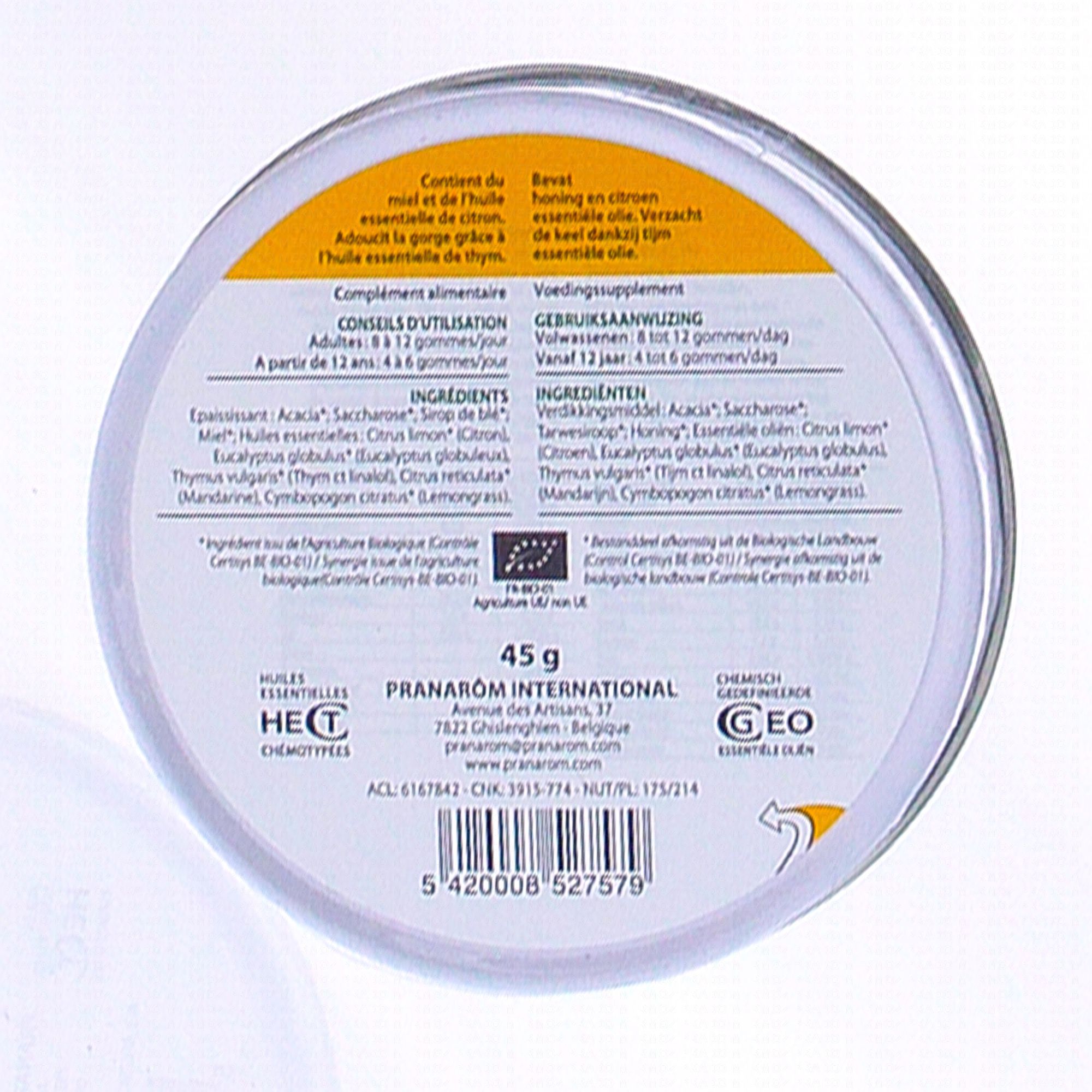 PRANAROM Aromaforce - 45 Gommes adoucissantes bio au miel et aux huiles essentielles de citron et de thym.