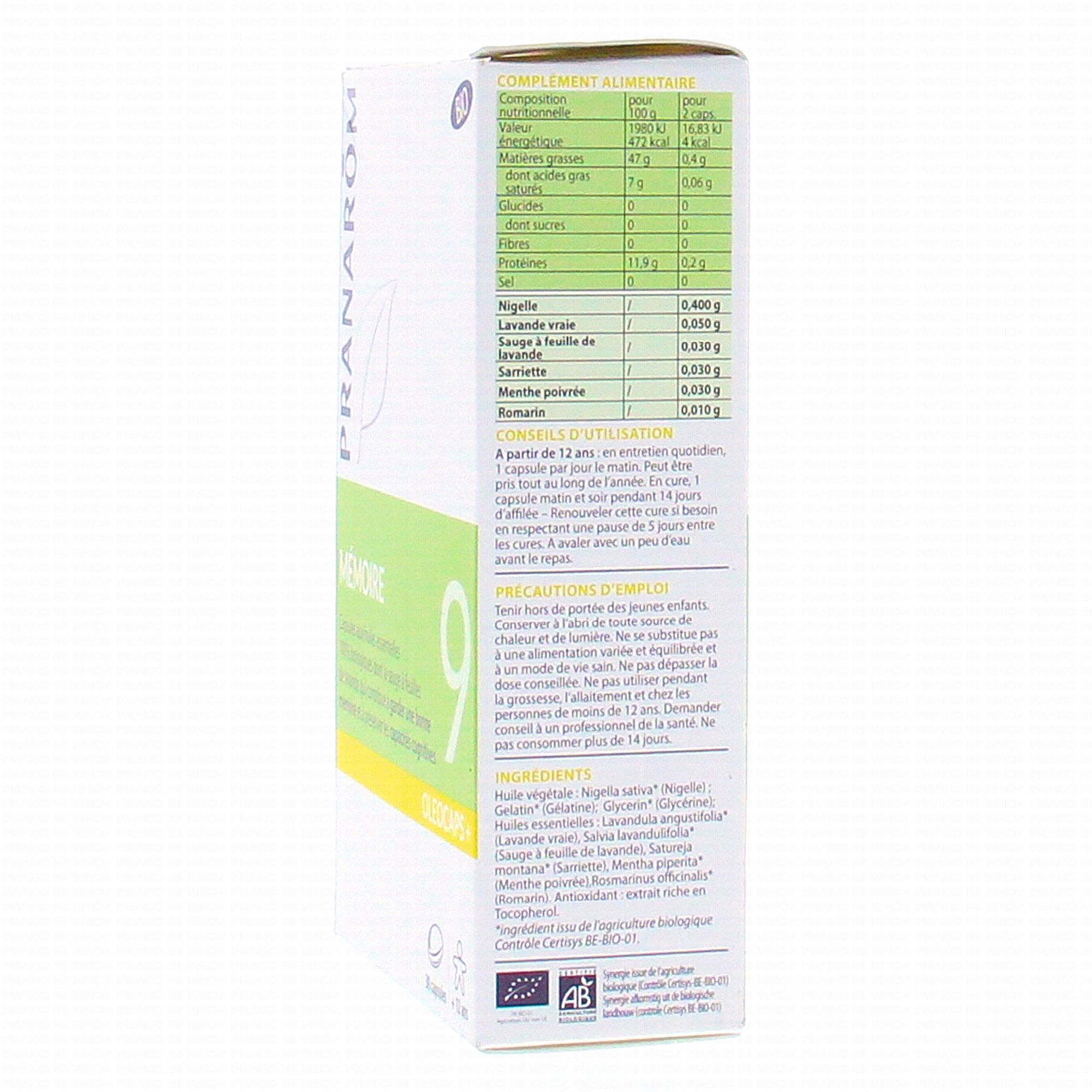 PRANAROM Oleocaps + Mémoire 30 caspules contient les éléments suivants :