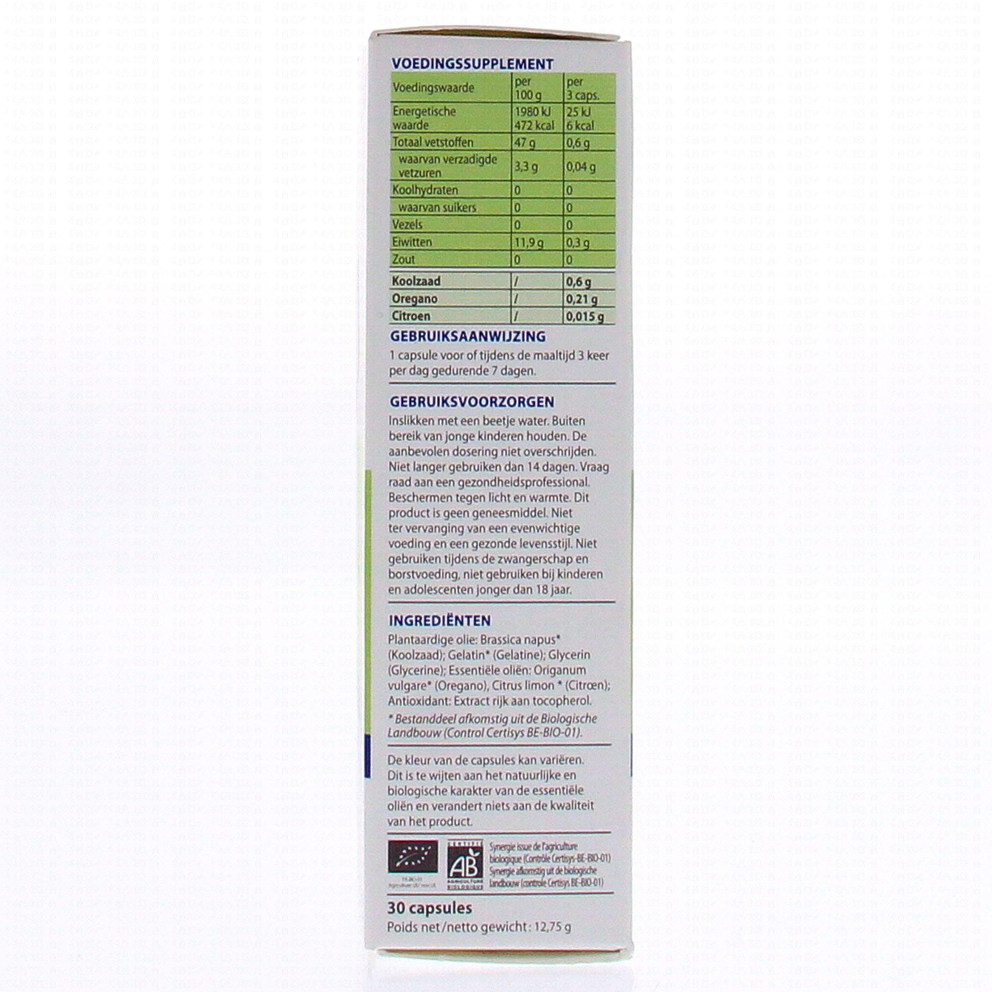 Huile végétale: Brassica napus* (Colza); Gelatin* (Gelatine); Glycerin* (Glycerine); Huiles essentielles: Origanum vulgare* (Origan vulgaire), Citrus limon* (Citron); Antioxidant: Extrait riche en tocopherol. *Ingrédient issu de l'agriculture biologique (contrôle Certisys BE-BIO-01) - BIO signifie : issu de l'agriculture biologique (contrôle Certisys BE-BIO-01).