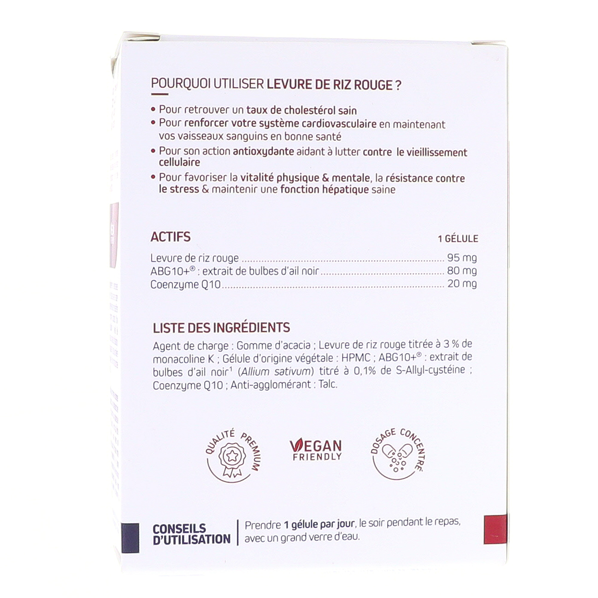 Agent de charge : Gomme d'acacia, Levure de riz rouge titrée à 3% de monacoline K, Gélule d'origine végétale : HPMC, ABG10+® : extrait de bulbes d'ail noir (Allium sativum) titré à 0,1% de S-Allyl-cystéine, Coenzyme Q10, Anti-agglomérant : Talc.