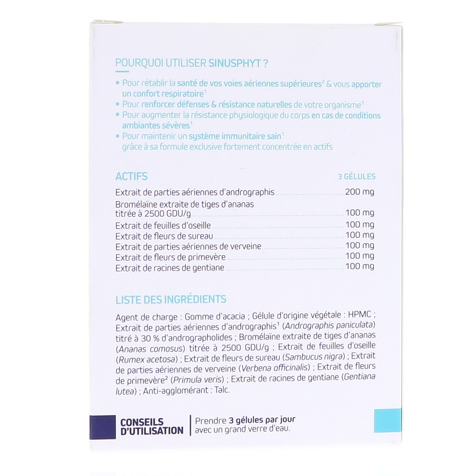 Agent de charge : Gomme d'acacia, Gélule d'origine végétale : HPMC, Extrait de parties aériennes d'andrographis (Andrographis paniculata) titré à 30 % d'andrographolides, Extrait de tiges d'ananas (Ananas comosus) titré à 2500 GDU/g de bromélaïne, Extrait de feuilles d'oseille (Rumex acetosa), Extrait de fleurs de sureau (Sambucus nigra), Extrait de parties aériennes de verveine (Verbena officinalis), Extrait de fleurs de primevère (Primula veris), Extrait de racines de gentiane (Gentiana lutea), Anti-agglomérant : Talc.