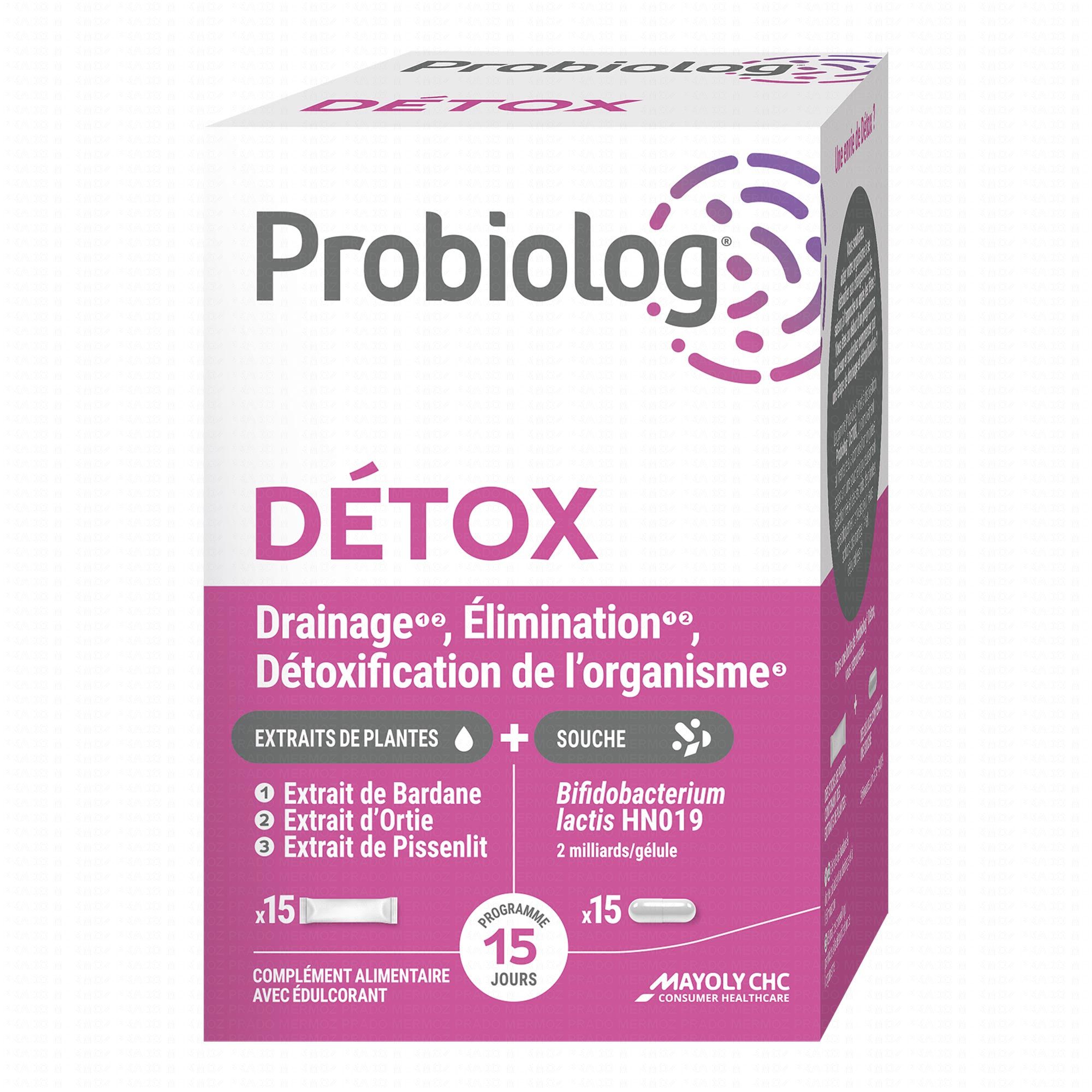Probiolog DETOX est un complément alimentaire associant une souche rigoureusement sélectionnée et des extraits de plantes. L'extrait de bardane et l'extrait d'ortie aident au drainage et à l'élimination de pissenlit qui contribue à la détoxification de l'organisme.