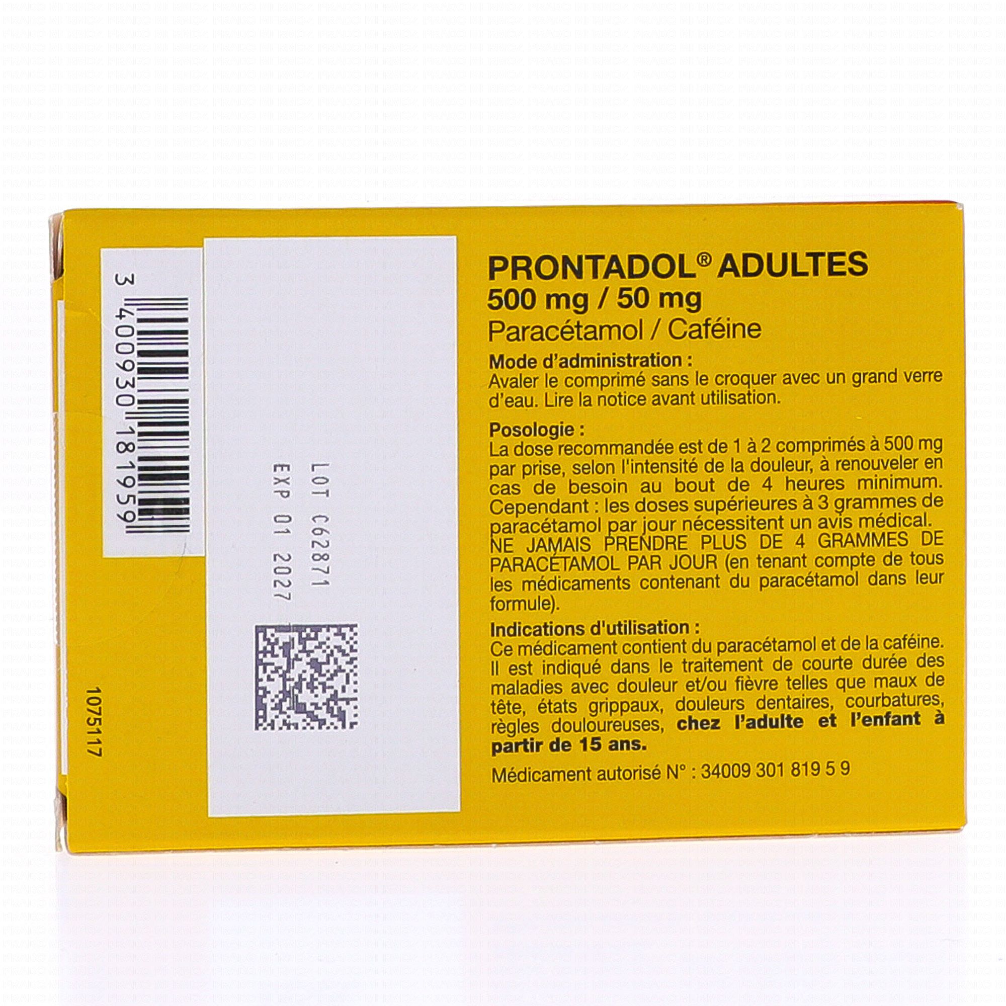 PRONTADOL ADULTES est indiqué chez les adultes et les enfants de plus de 15 ans dans le traitement symptomatique des douleurs d'intensité légère à modérée et/ou des états fébriles.