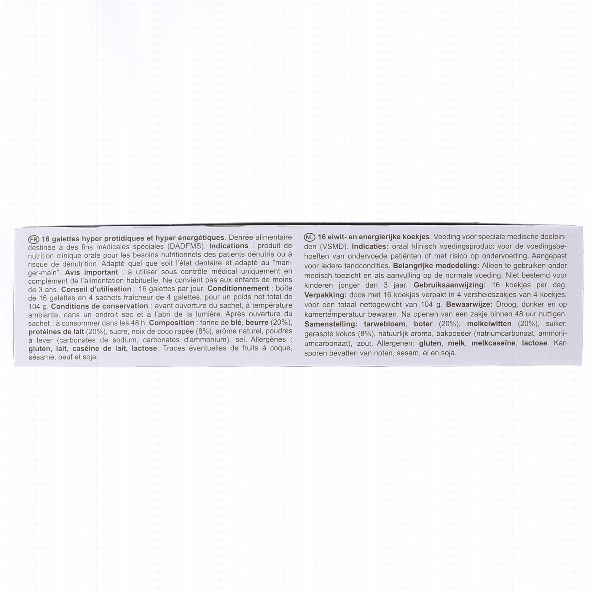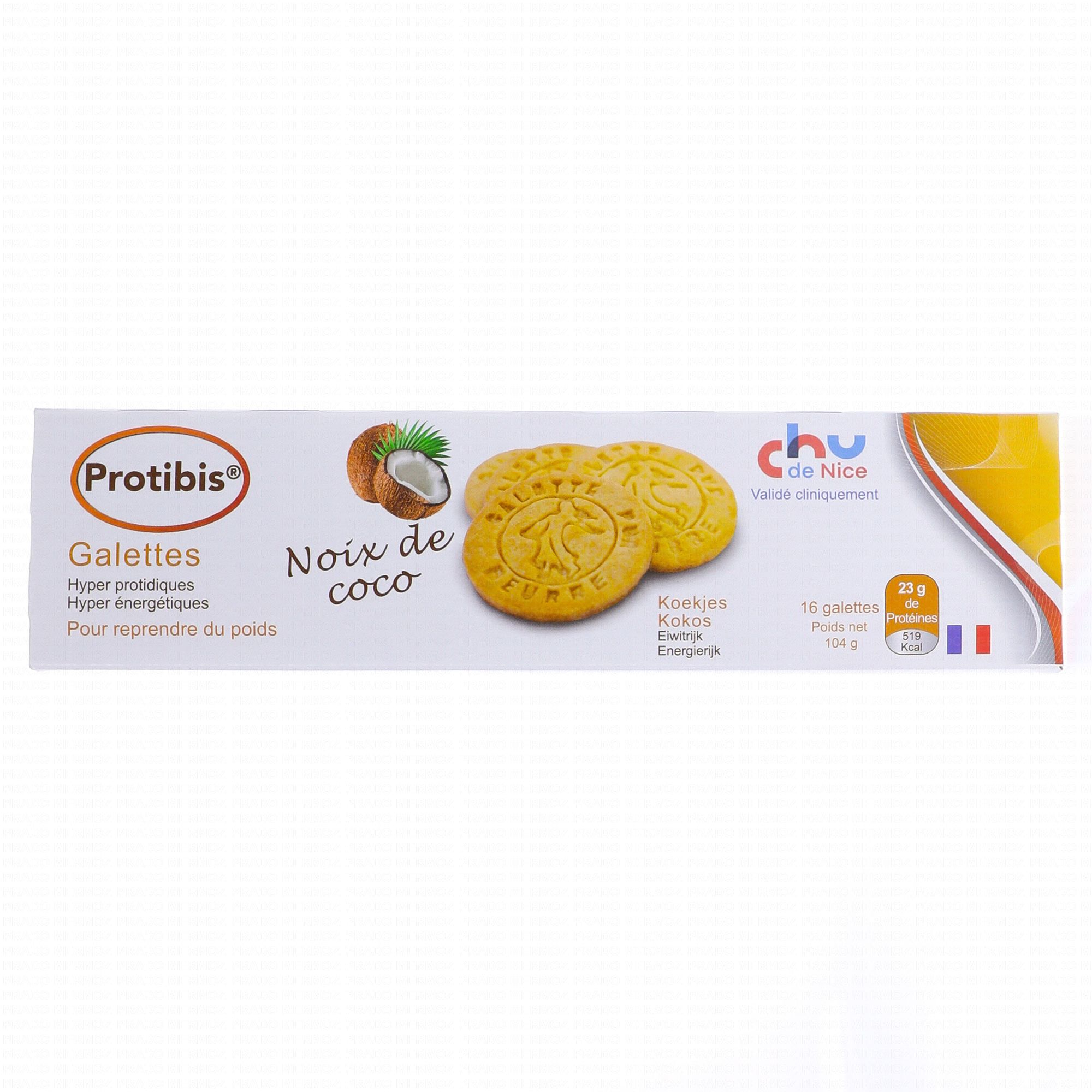 NUTRISENS Protibis Galettes Noix de Coco x16 est un complément alimentaire destiné aux personnes ayant besoin d'un apport accru en protéines et en calories. 8 galettes apportent 11,5 grammes de protéines et 250kcal.