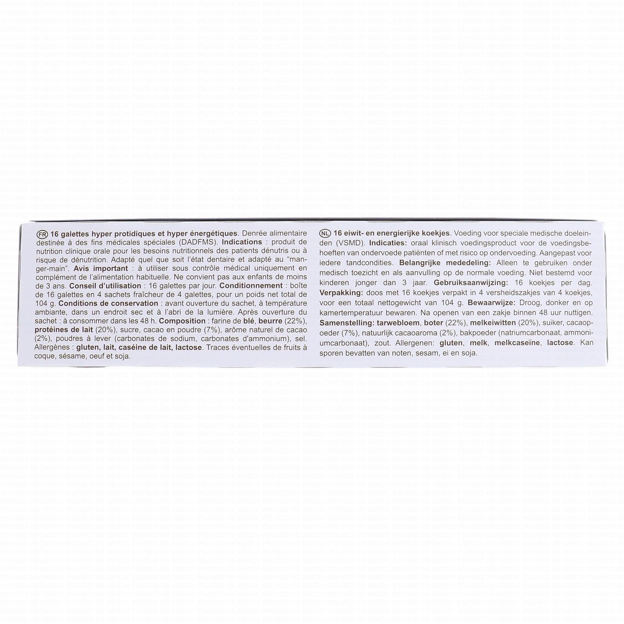 NUTRISENS Protibis Galettes cacao x16 est un complément alimentaire destiné aux personnes ayant besoin d'un apport accru en protéines et en calories. 8 galettes apportent 12 grammes de protéines et 244kcal. Si la personne souffre de problèmes de mastication; vous pouvez ramollir les biscuits en les trempant dans une boisson chaude ou froide.