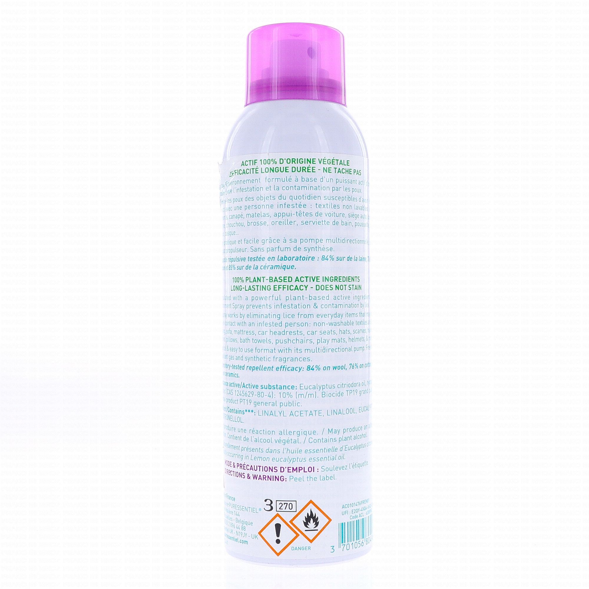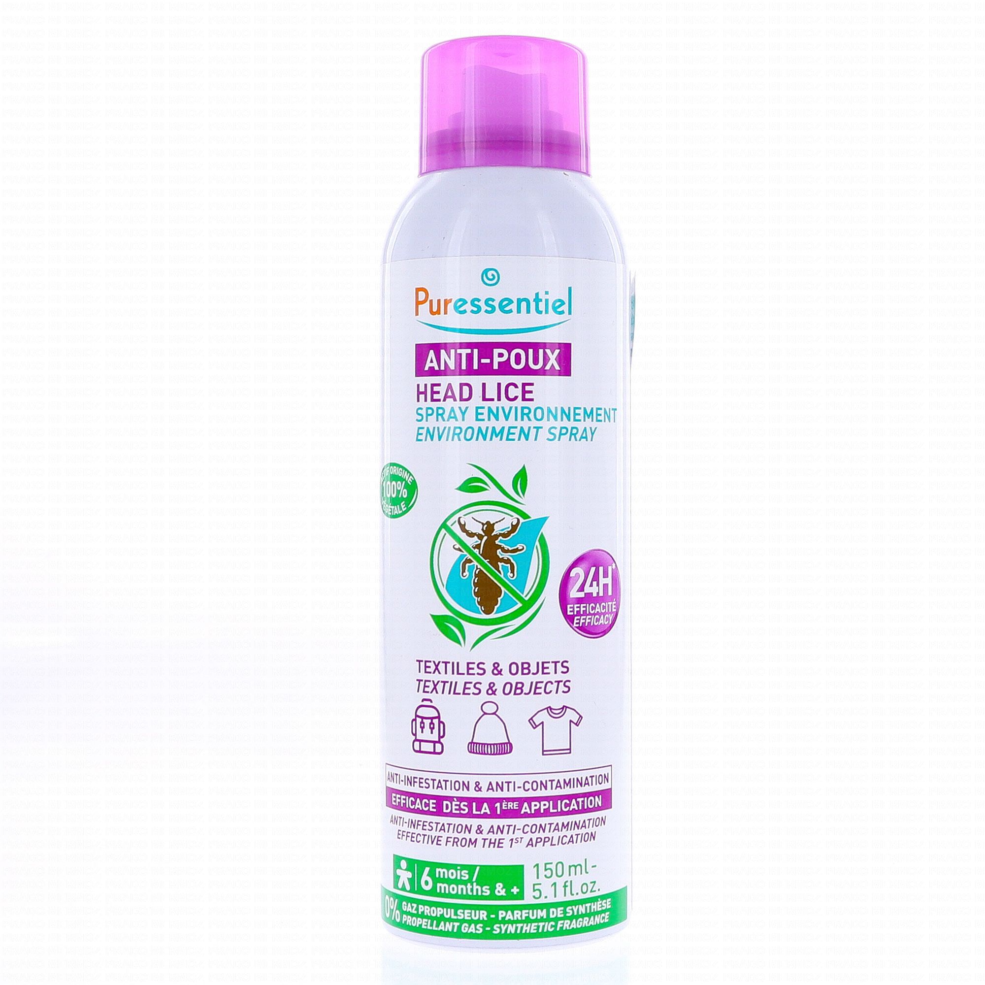 Le répulsif environnement anti-poux proposé par la marque Puressentiel a pour but de repousser et éliminer les poux des textiles et objets du quotidien susceptibles d'avoir été en contact avec une personne infestée : textiles non lavables à 60 °C, vêtements, canapé, matelas, appui-têtes de voiture, siège auto, bonnet, écharpe, chouchou, brosse, oreiller, serviette de bain, poussette, tapis de jeux, casque...
