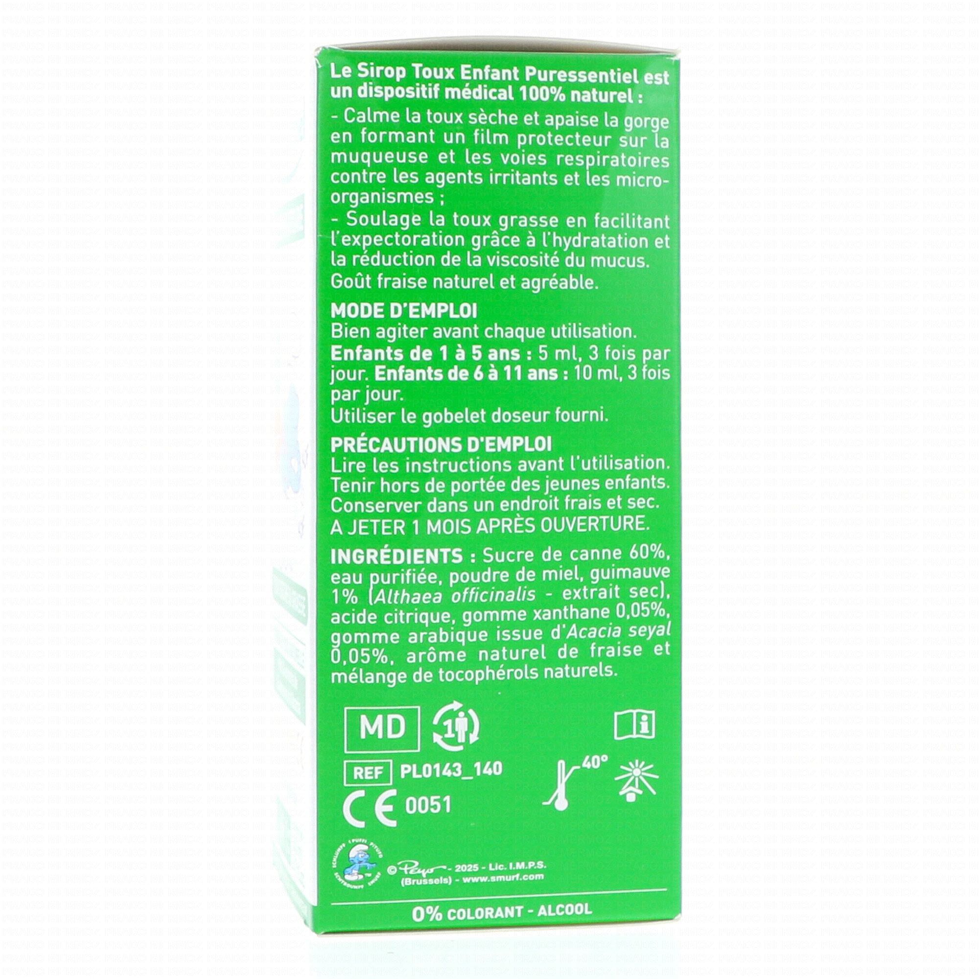 Enfants de 1 à 5 ans : à l'aide du gobelet doseur fourni, prenez 5 ml de sirop pour la toux Puressentiel 3 fois par jour.