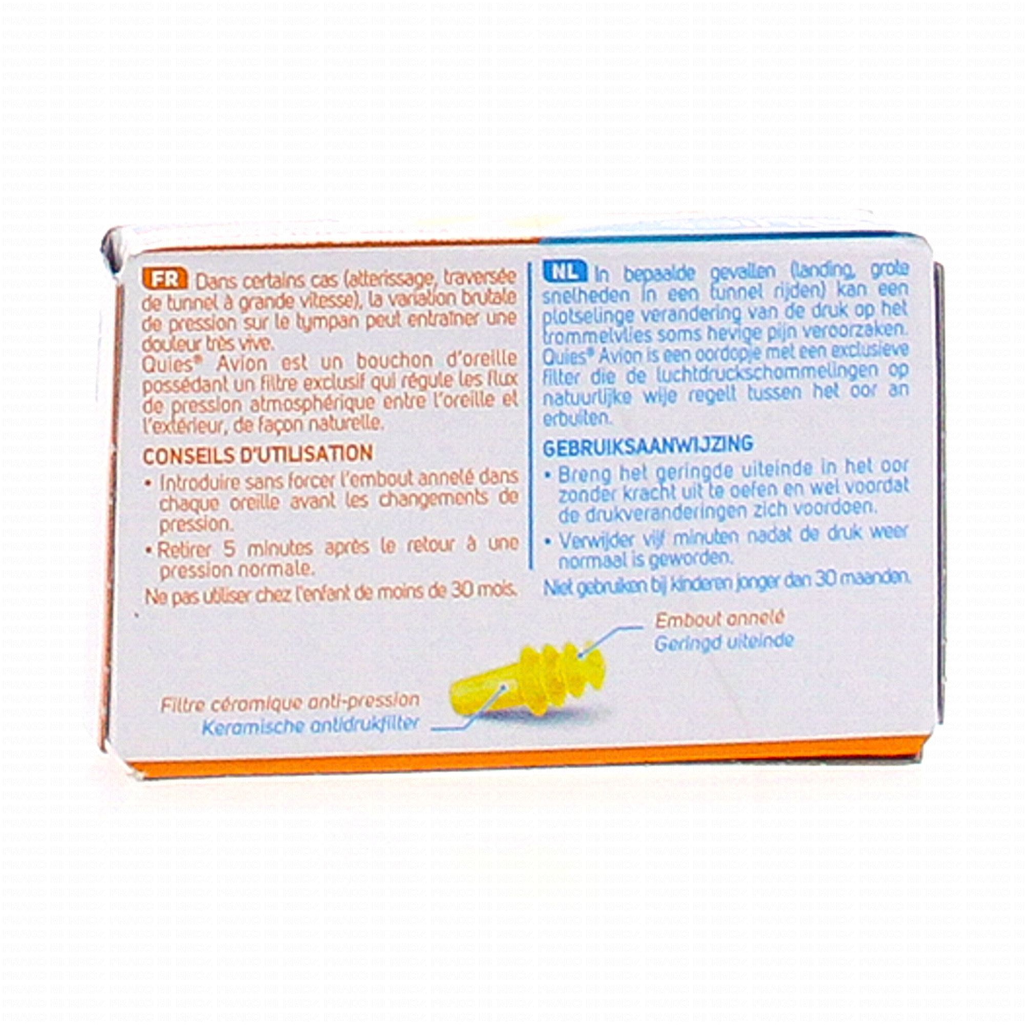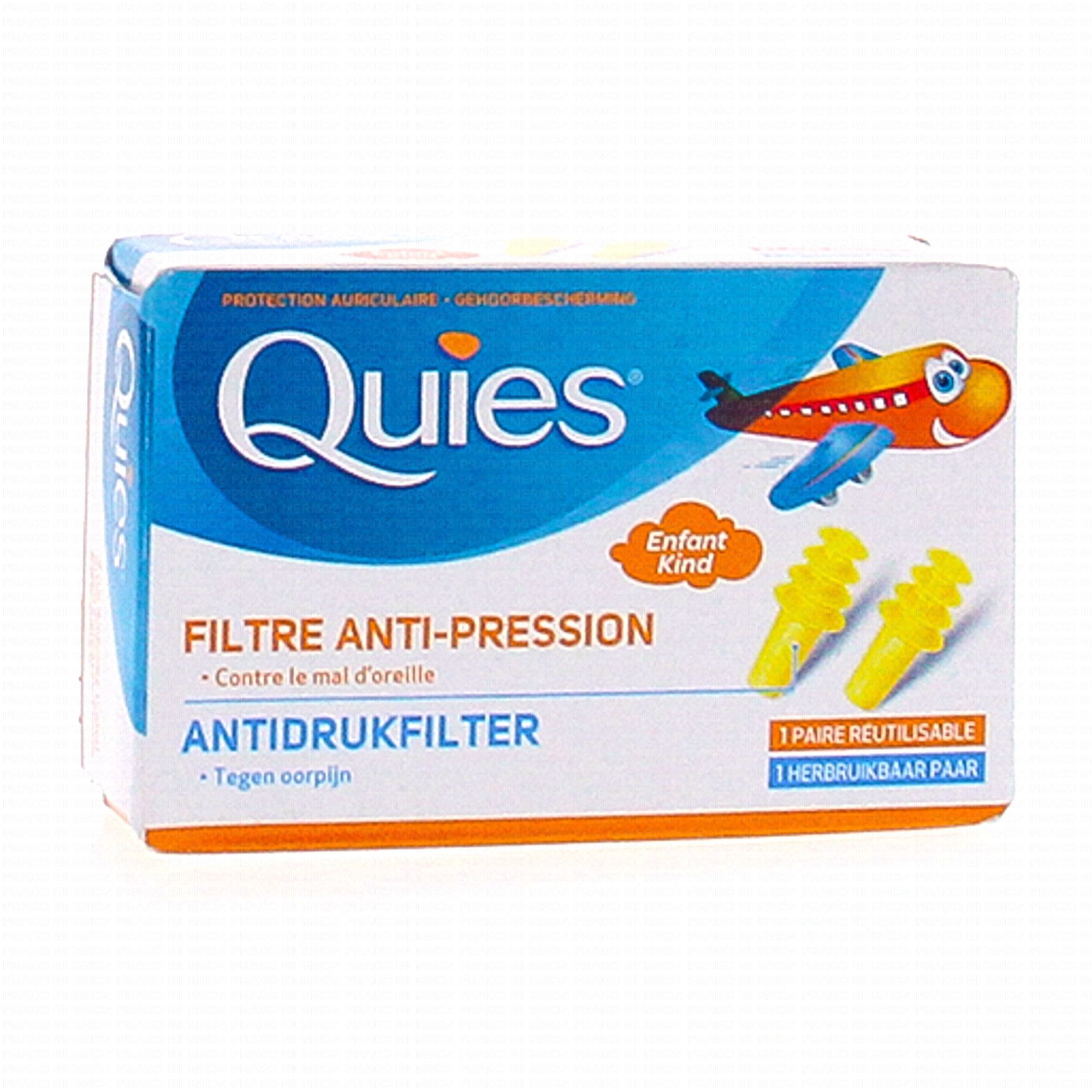 Les Bouchons auriculaires spécial avion pour enfants Quies protègent les oreilles des tous petits lors des voyages en avion. Hypoallergénique, doux, réutilisable, facile à insérer. Forme allongée, ergonomique, de petite taille, bout annelé, muni d'un filtre exclusif permettant à l'oreille de s'adapter plus facilement aux différences de pression atmosphérique. Coloris : bleu. Conditionnement : boîte carton.