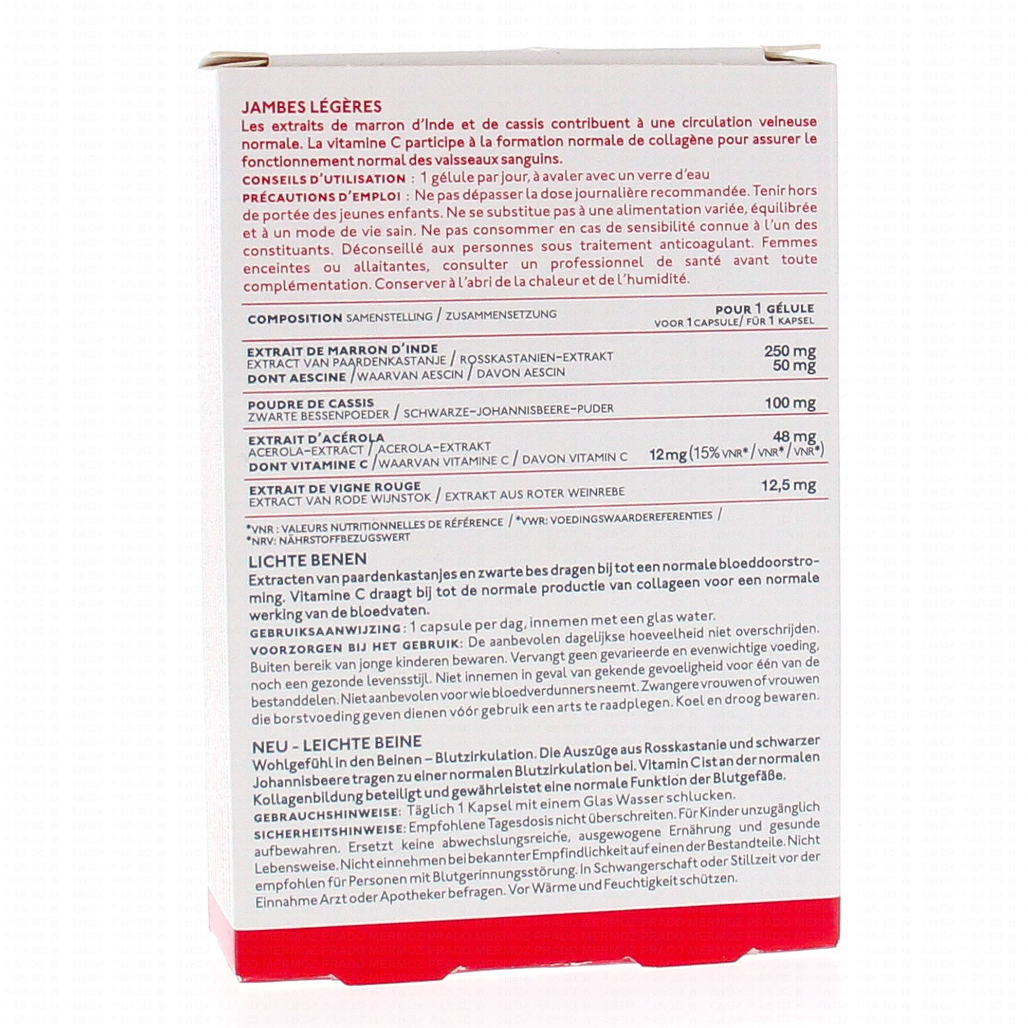 Extrait sec de graines de Marronnier d'Inde (Aesculus hippocastanum L.) ; Poudre de cassis fruit (Ribes nigrum L.) ; Gélule végétale (agent d'enrobage : hydroxypropylmethylcellulose) ; Extrait de fruit d'Acérola (Malpighia glabra L.) ; Extrait sec de feuilles de vigne rouge (Vitis vinifera L.) ; Anti-agglomérant : sel de magnésium d'acide gras ; Maltodextrine.