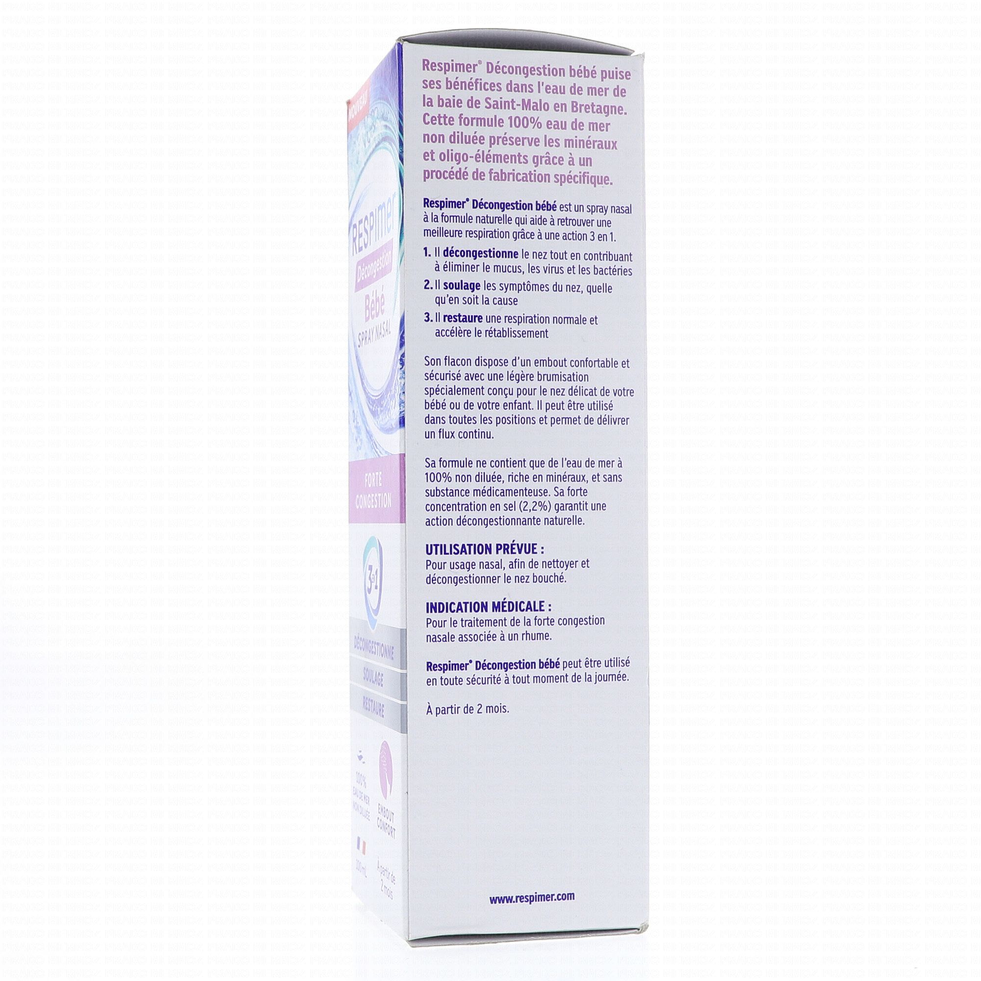 Le respimer décongestion est un spray nasal doux qui convient au bébé à partir de 2 mois. Il décongestionne et aide à éliminer le mucus, les virus et bactéries, soulage les symptômes et restaure la respiration.