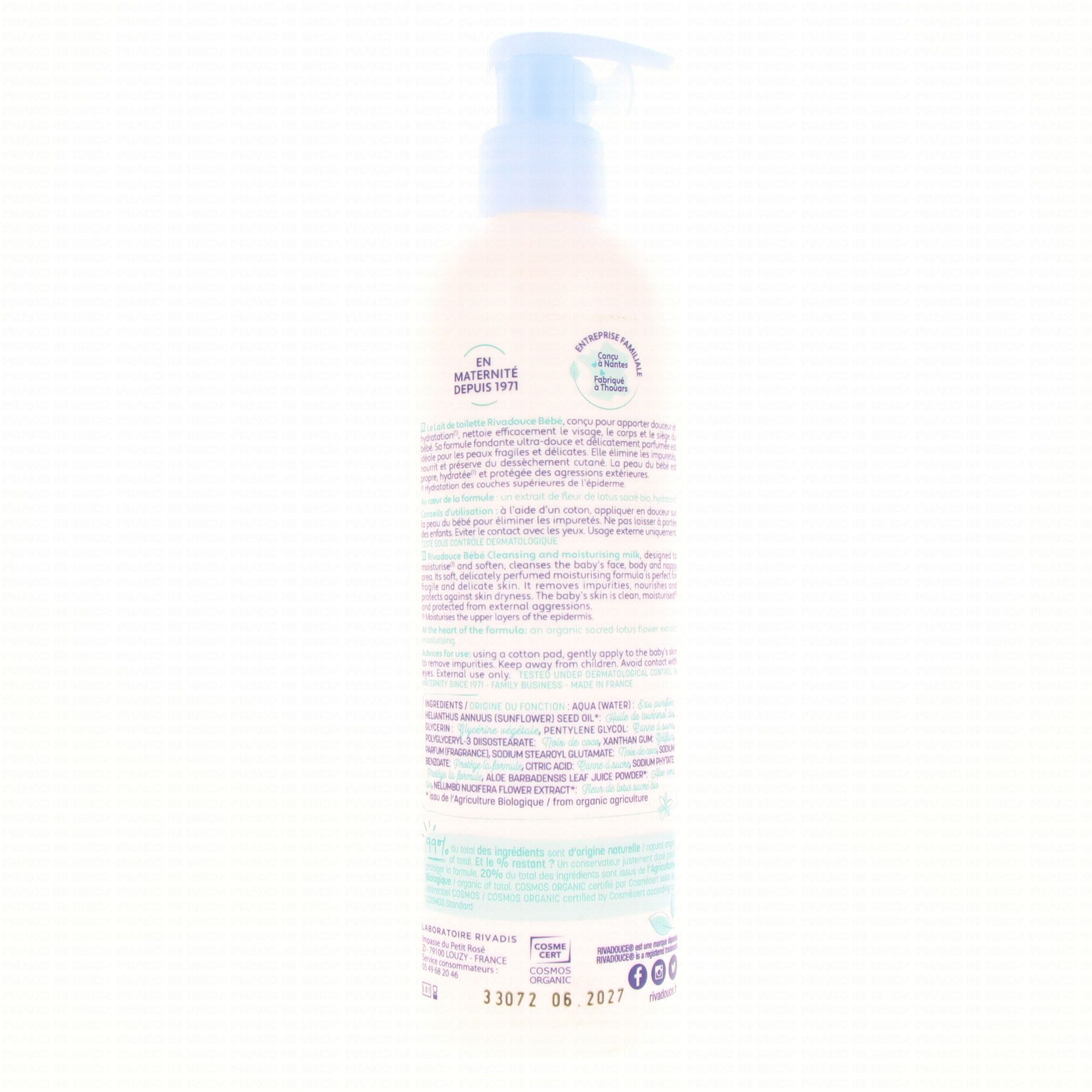 - RESPECT DE LA PEAU DE BÉBÉ : le Lait de toilette Bébé certifié Bio Rivadouce, onctueux et sans rinçage, élimine efficacement les salissures du siège, des zones de plis, du visage de Bébé tout en apportant douceur et hydratation. Il est spécialement formulé pour prendre soin de la peau sensible des tout-petits.