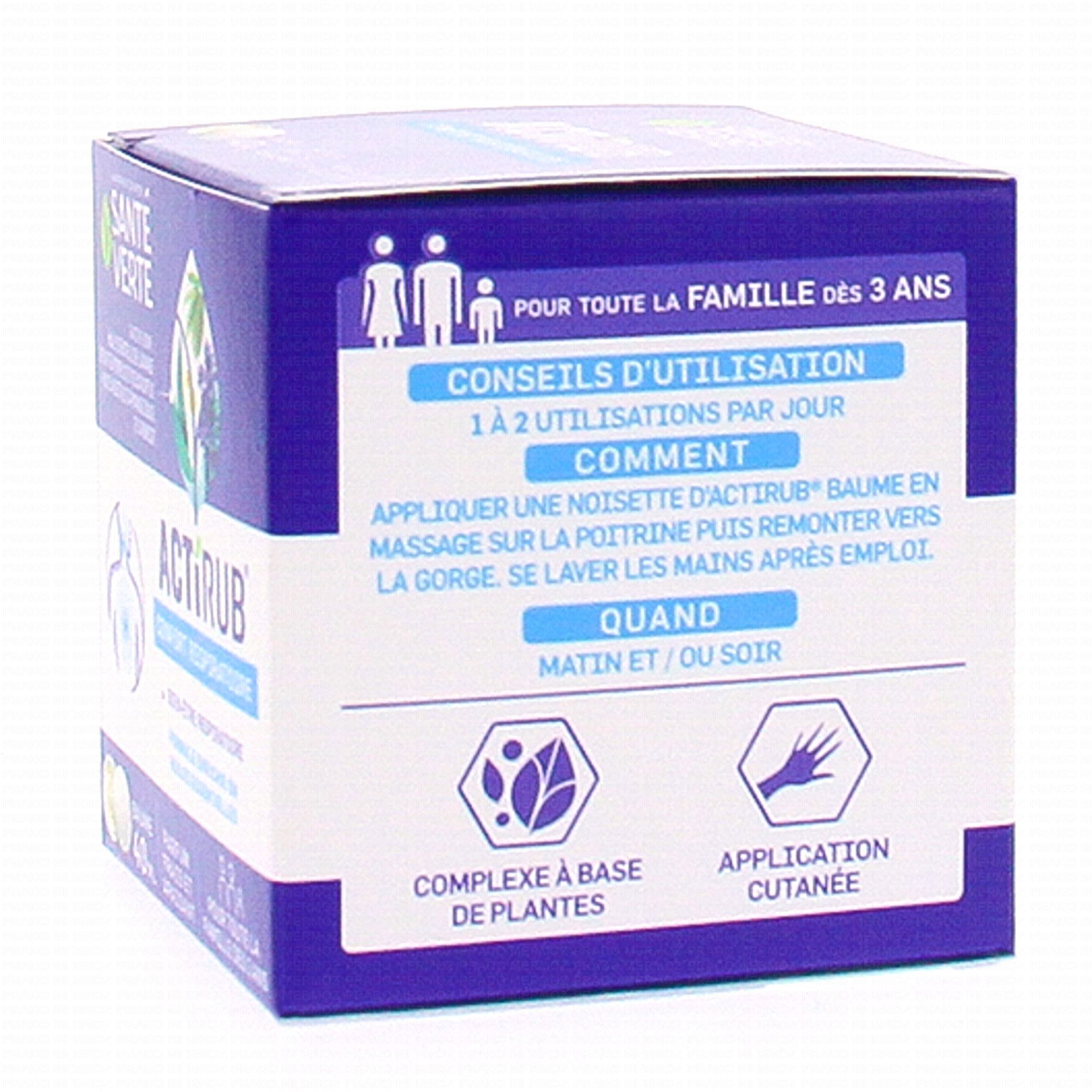 Matin et/ou soir, appliquer une noisette d'Actirub baume pectoral sur la poitrine, le dos et la gorge et masser légèrement.