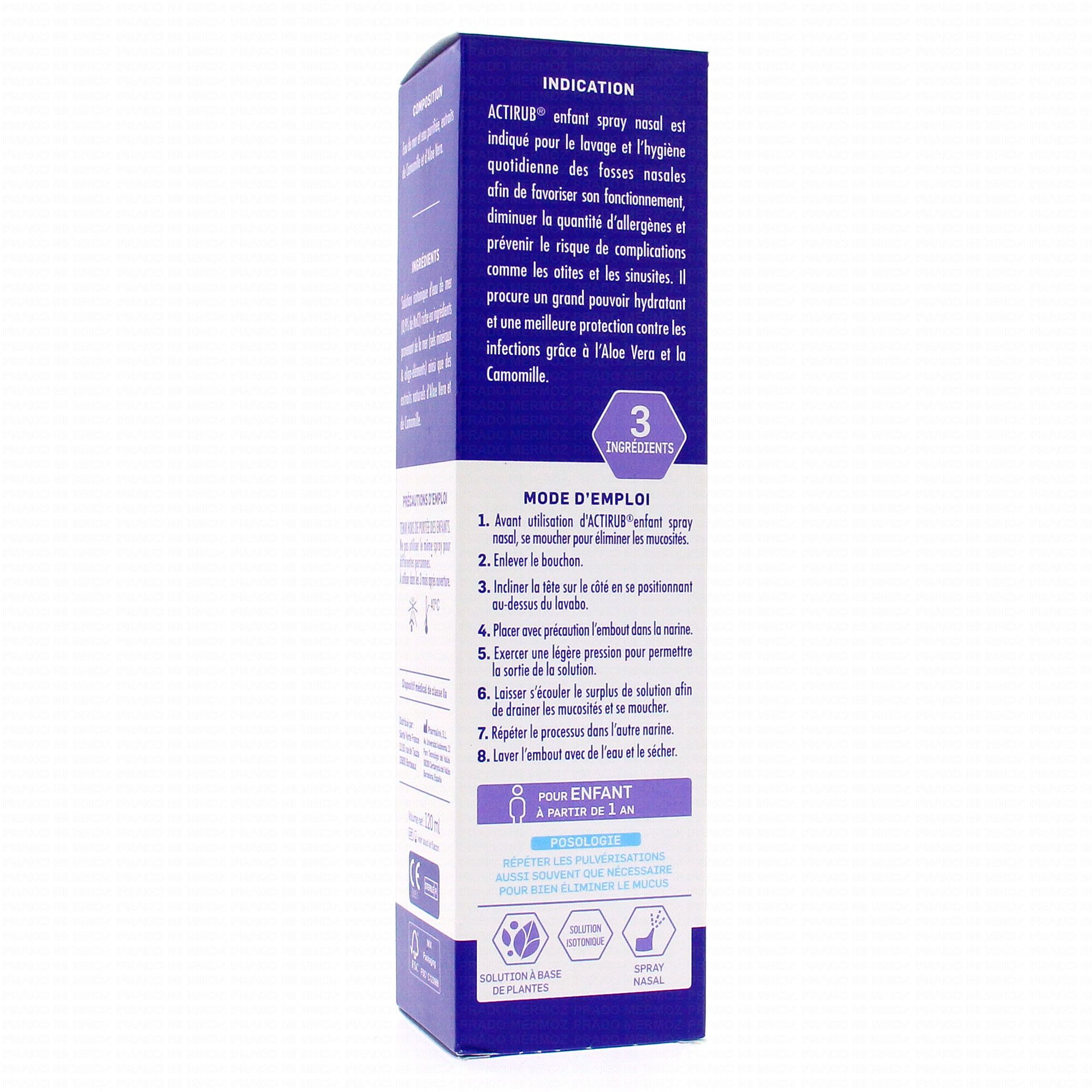 Ce spray nasal Actirub est composé d'extraits de plantes d'aloe vera et de camomille et est destiné au nettoyage et l'hygiène du nez. Il prévient des risques d'otites et de sinusites et protège des infections en fluidifiant et hydratant les fosses nasales