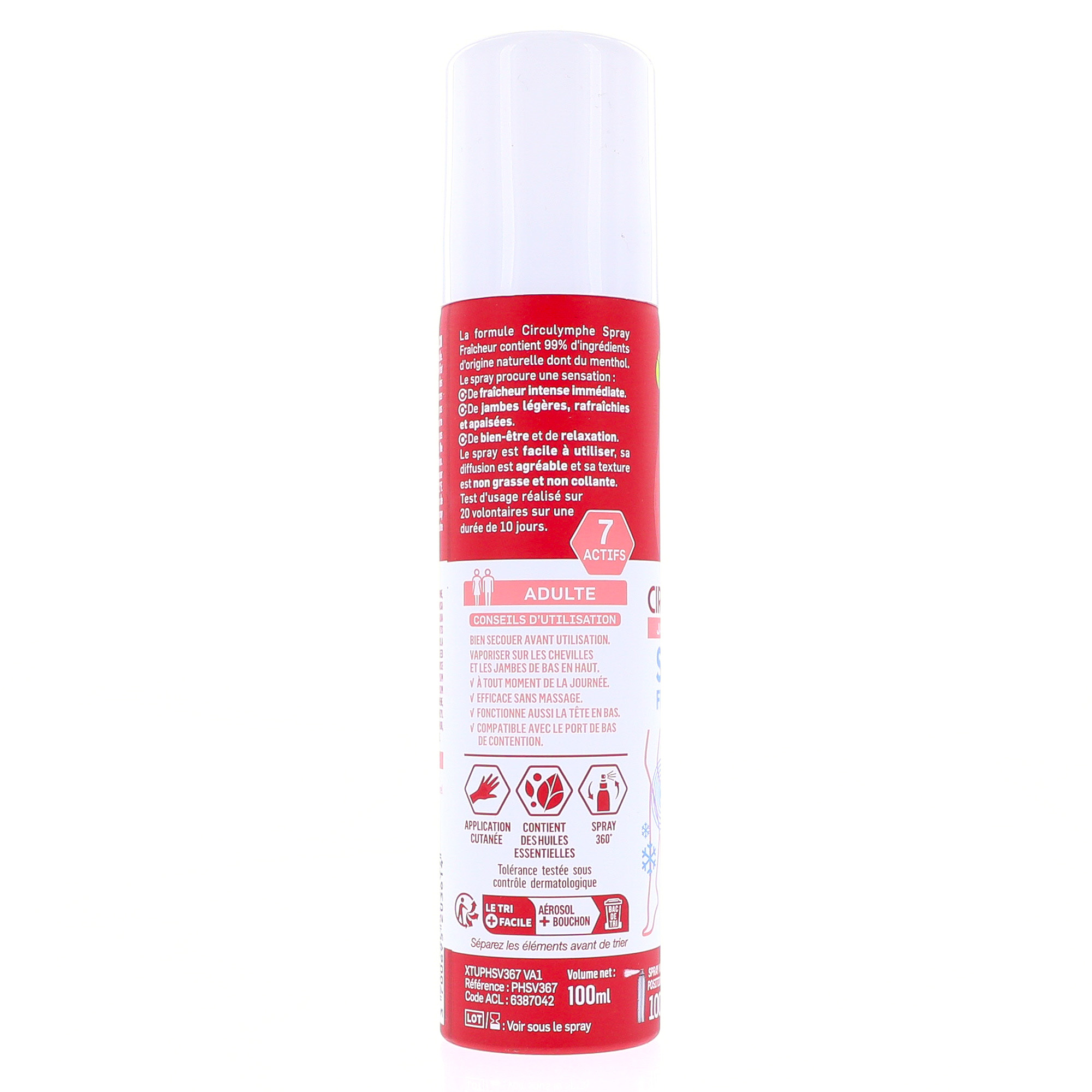 La formule Circulymphe Spray Fraîcheur contient 99% d'ingrédients d'origine naturelle dont du menthol. Le spray procure une sensation :